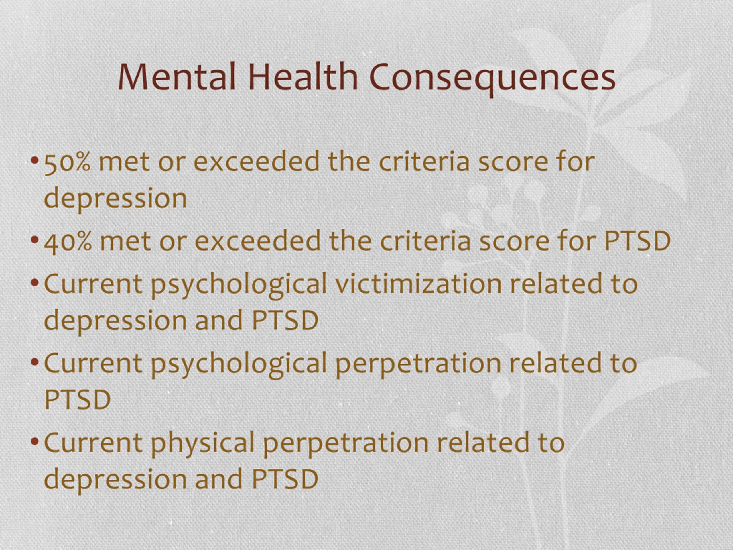 Mental Health Consequences 50% met or exceeded the criteria score for depression 40% met or exceeded the criteria score for PTSD Current psychological victimization related to depression and PTSD Current psychological perpetration related to PTSD Current physical perpetration related to depression and PTSD