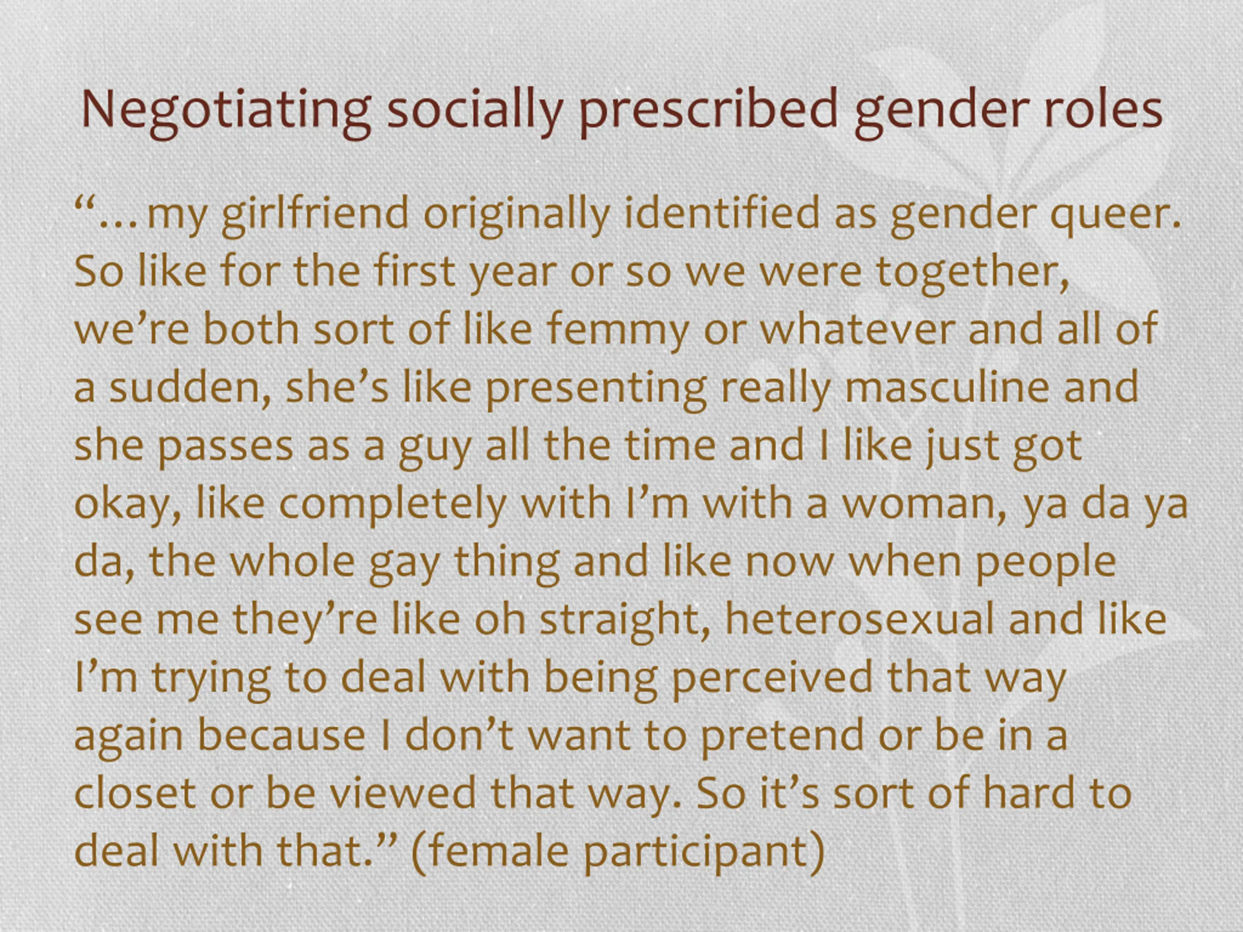Negotiating socially prescribed gender roles my girlfriend originally identified as gender queer. So like for the first year or so we were together, we re both sort of like femmy or whatever and all of a sudden, she s like presenting really masculine and she passes as a guy all the time and I like just got okay, like completely with I m with a woman, ya da ya da, the whole gay thing and like now when people see me they re like oh straight, heterosexual and like I m trying to deal with being perceived that way again because I don t want to pretend or be in a closet or be viewed that way. So it s sort of hard to deal with that. (female participant)