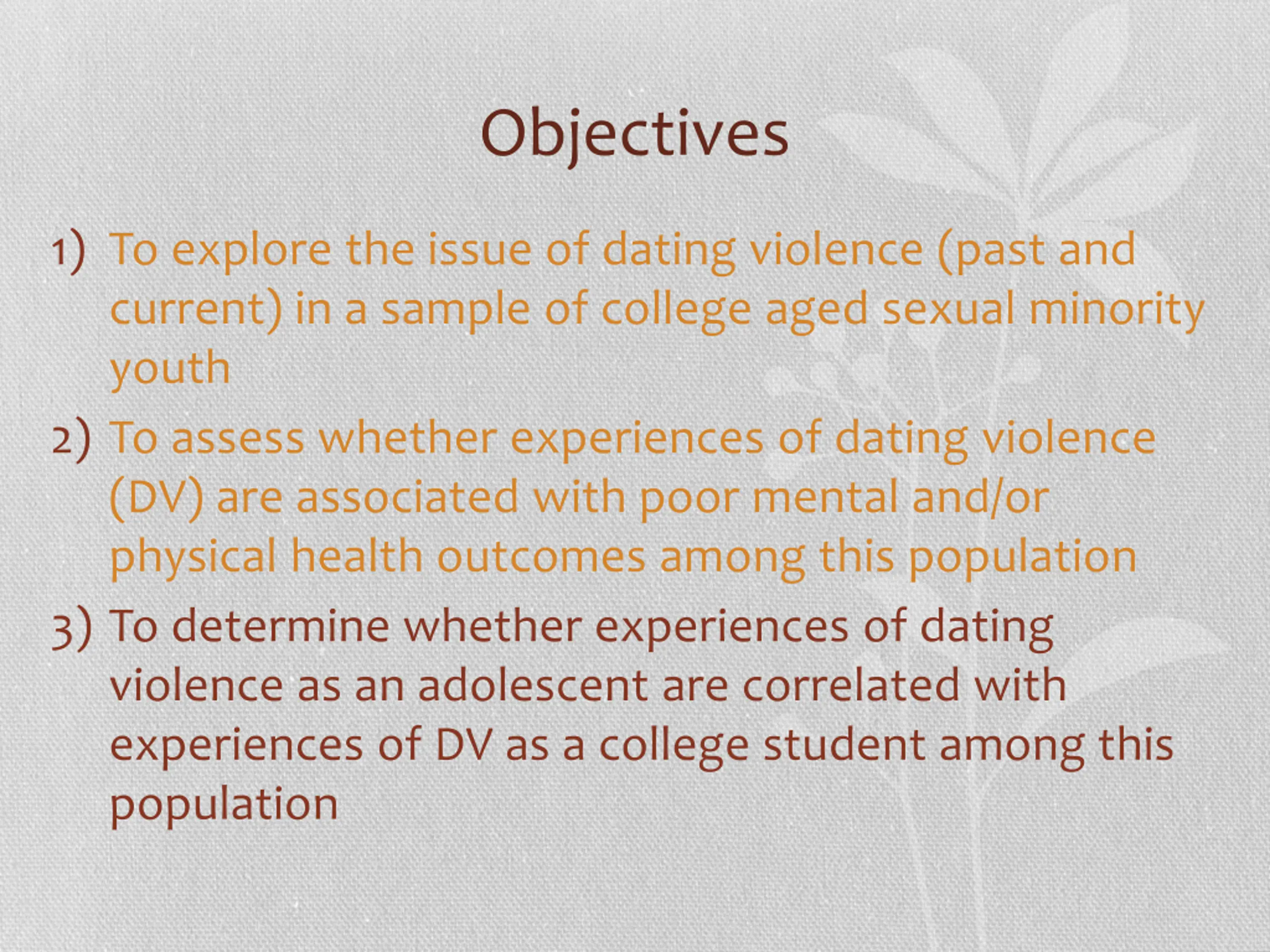 Objectives 1) To explore the issue of dating violence (past and current) in a sample of college aged sexual minority youth 2) To assess whether experiences of dating violence (DV) are associated with poor mental and/or physical health outcomes among this population 3) To determine whether experiences of dating violence as an adolescent are correlated with experiences of DV as a college student among this population