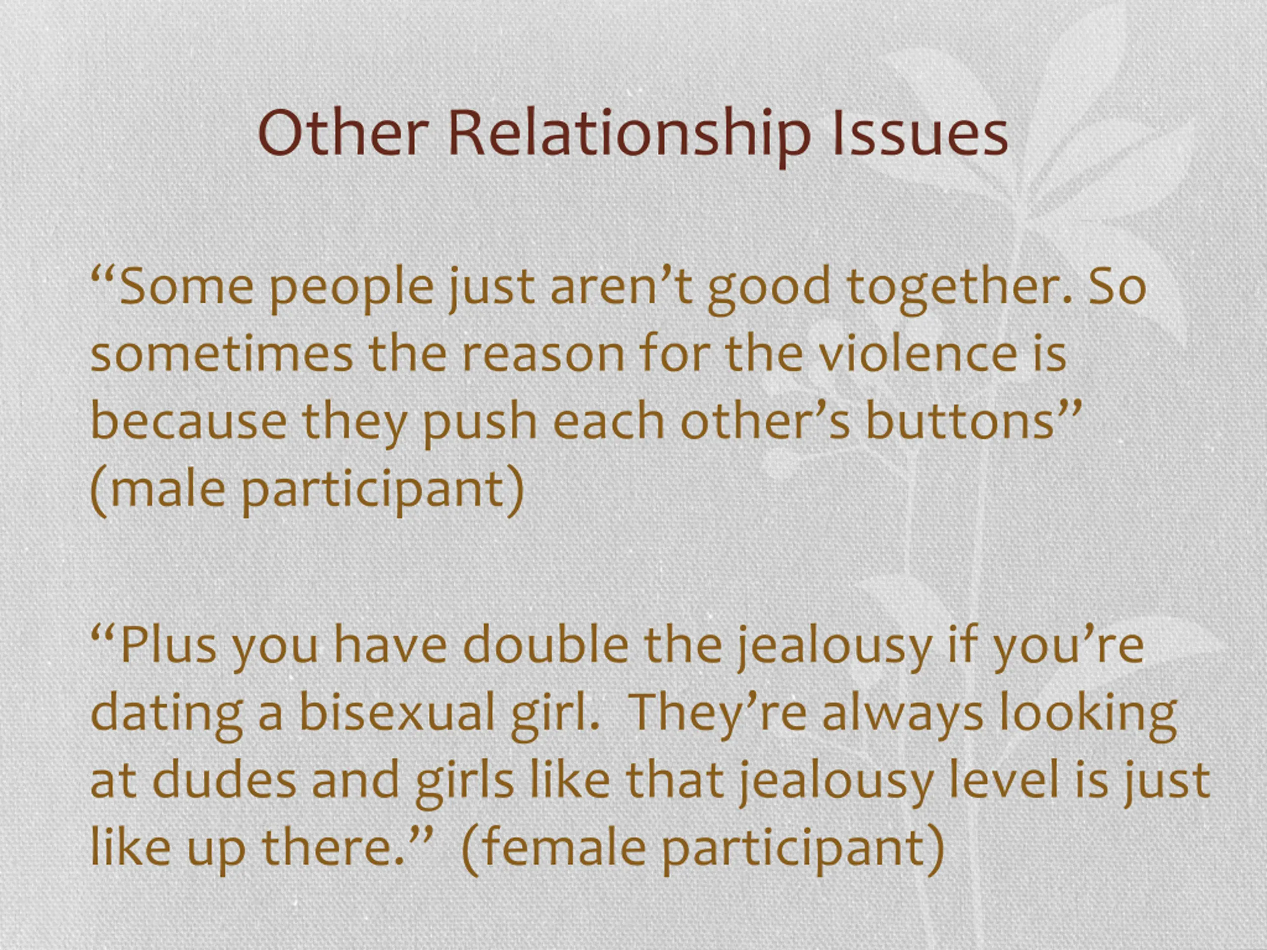 Other Relationship Issues Some people just aren t good together. So sometimes the reason for the violence is because they push each other s buttons (male participant) Plus you have double the jealousy if you re dating a bisexual girl. They re always looking at dudes and girls like that jealousy level is just like up there. (female participant)