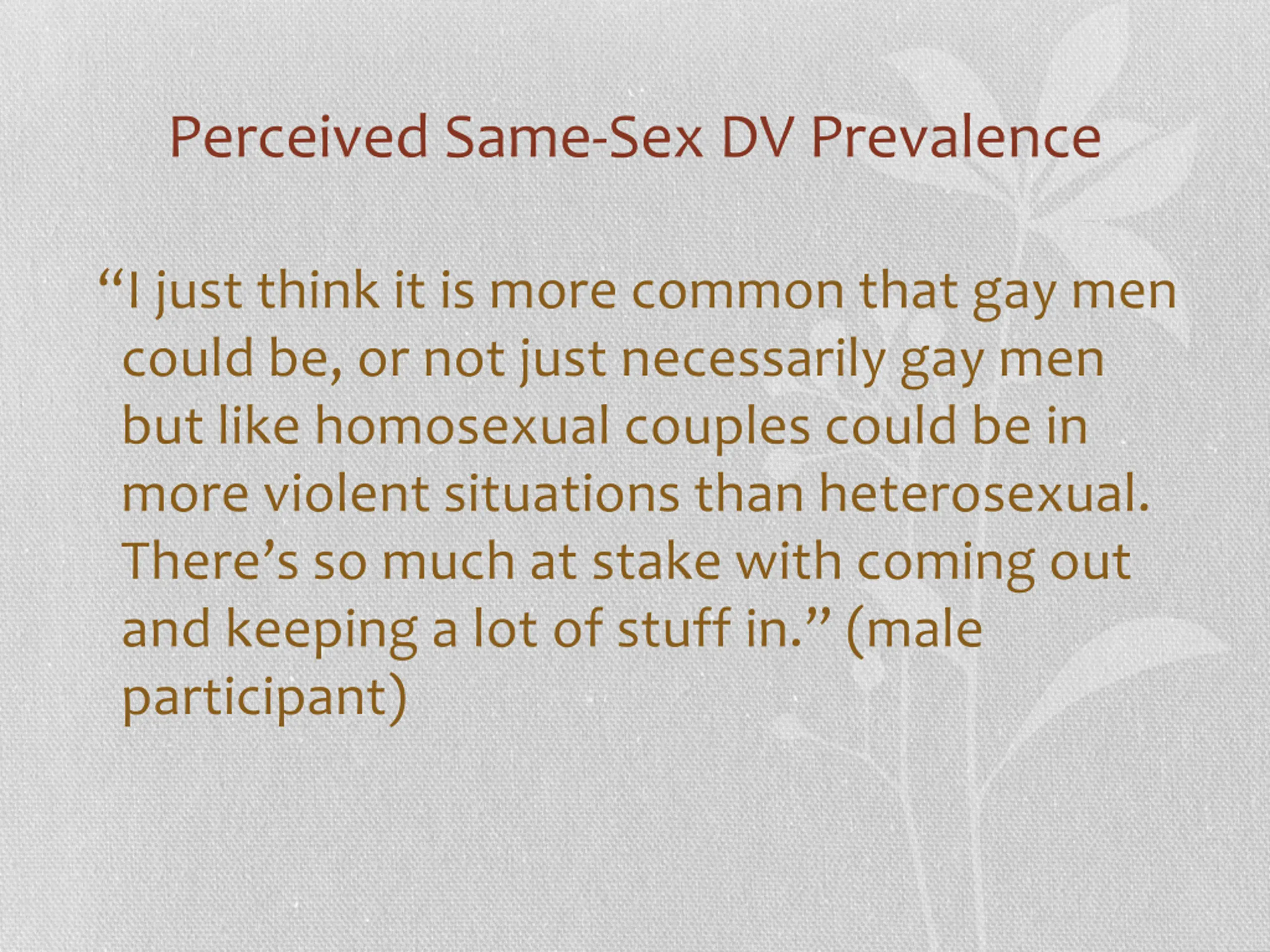 Perceived Same-Sex DV Prevalence I just think it is more common that gay men could be, or not just necessarily gay men but like homosexual couples could be in more violent situations than heterosexual. There s so much at stake with coming out and keeping a lot of stuff in. (male participant)