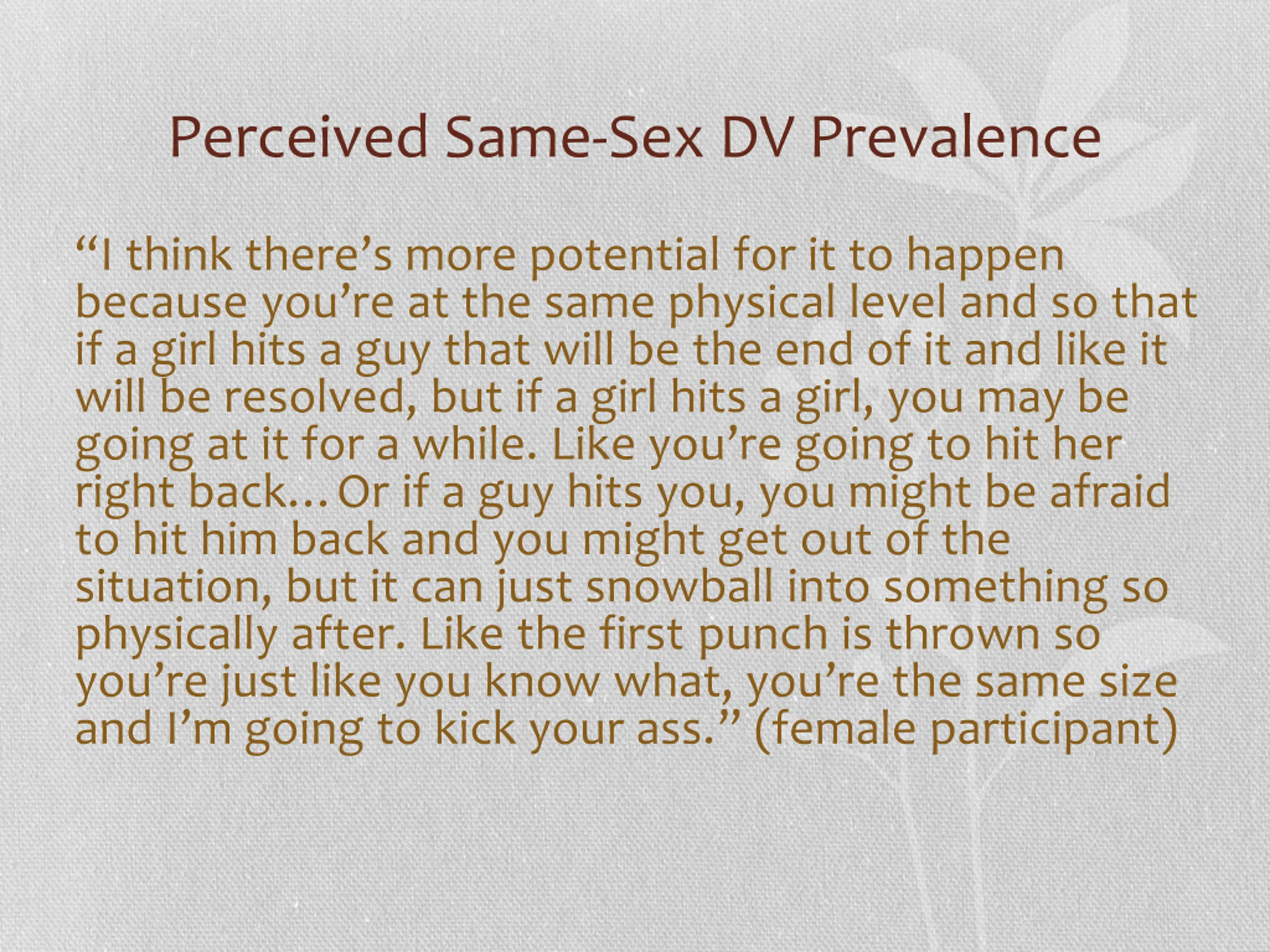 Perceived Same-Sex DV Prevalence I think there s more potential for it to happen because you re at the same physical level and so that if a girl hits a guy that will be the end of it and like it will be resolved, but if a girl hits a girl, you may be going at it for a while. Like you re going to hit her right back Or if a guy hits you, you might be afraid to hit him back and you might get out of the situation, but it can just snowball into something so physically after. Like the first punch is thrown so you re just like you know what, you re the same size and I m going to kick your ass. (female participant)