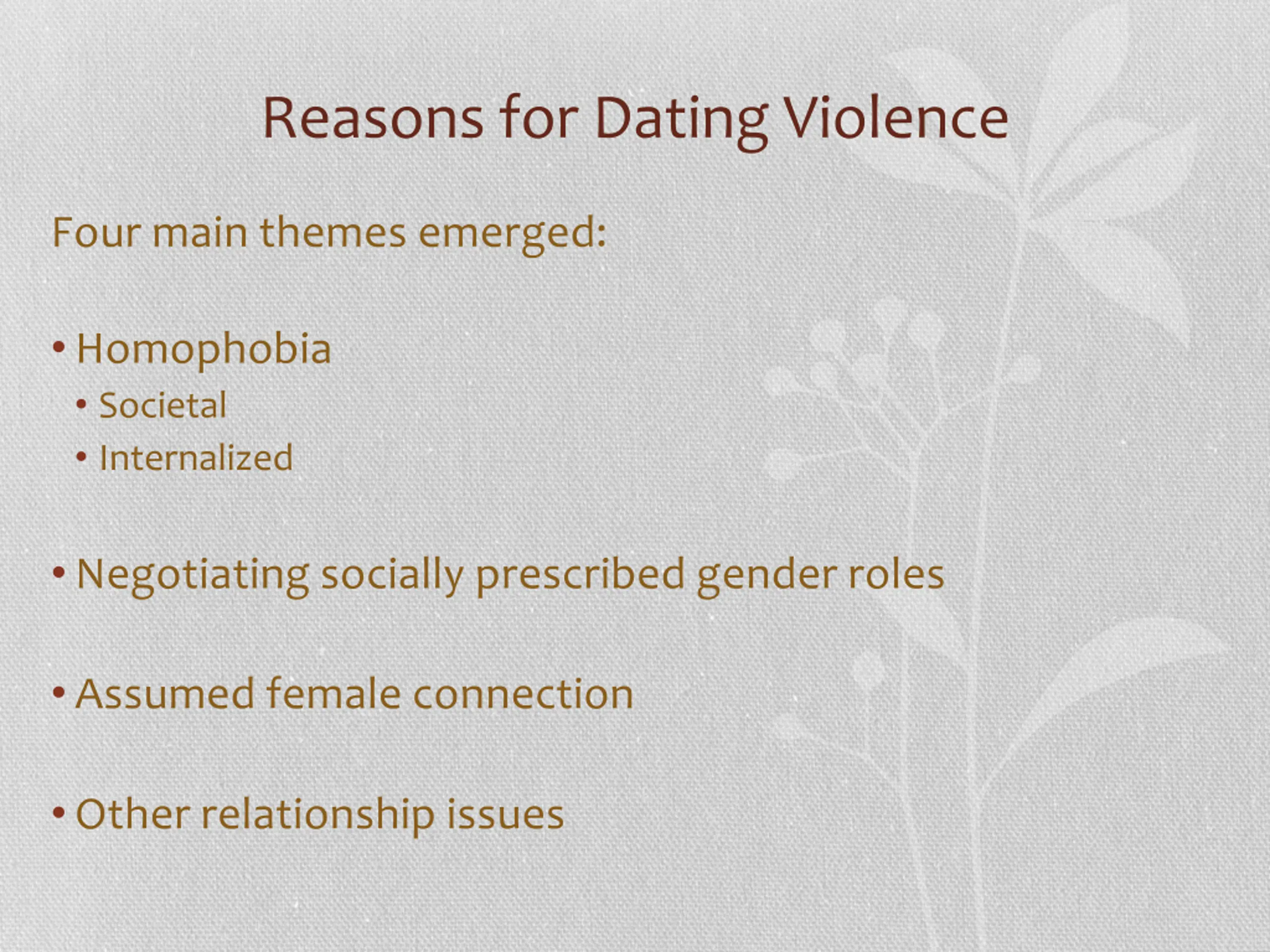 Reasons for Dating Violence Four main themes emerged: Homophobia Societal Internalized Negotiating socially prescribed gender roles Assumed female connection Other relationship issues