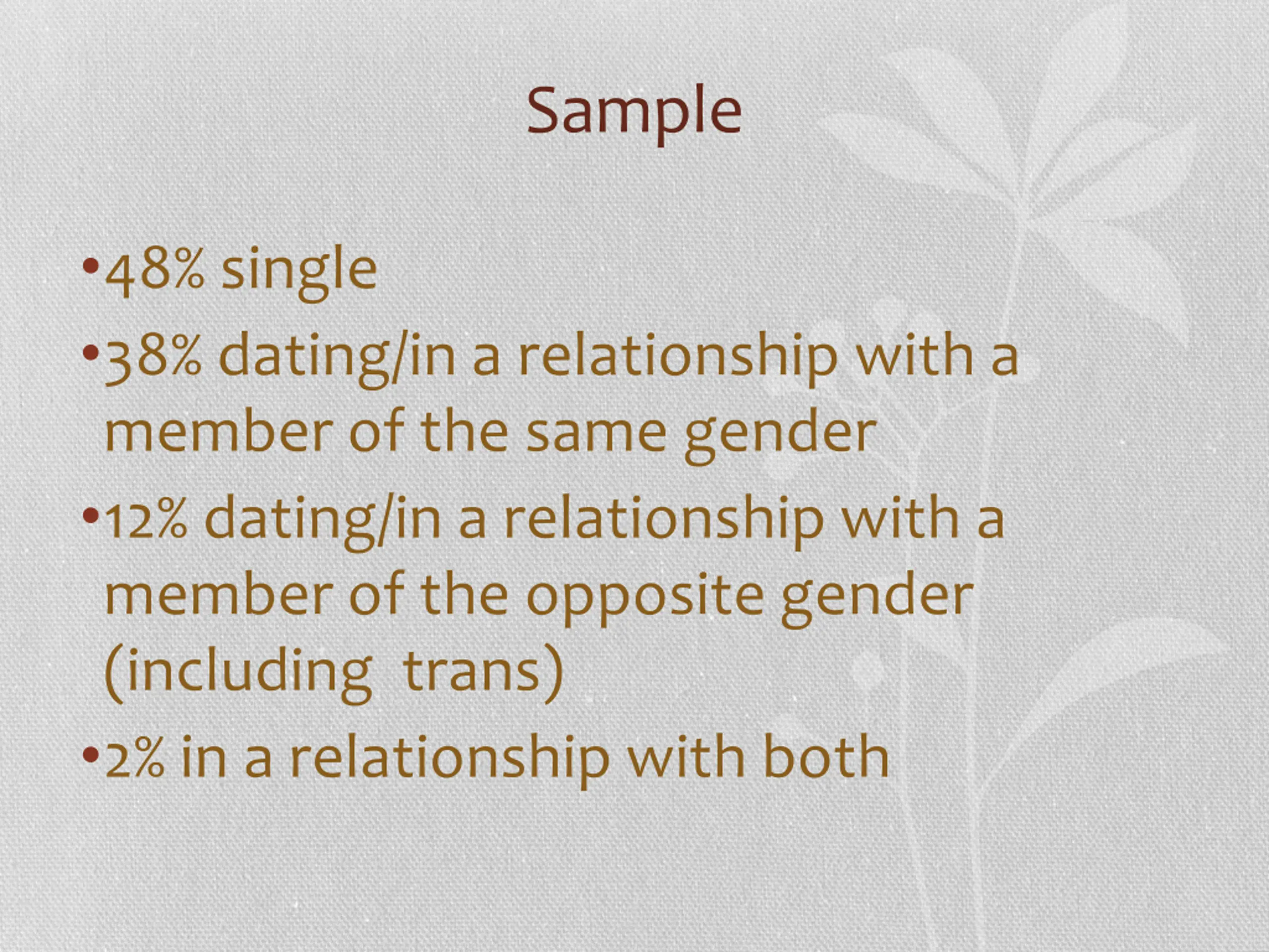 Sample 48% single 38% dating/in a relationship with a member of the same gender 12% dating/in a relationship with a member of the opposite gender (including trans) 2% in a relationship with both