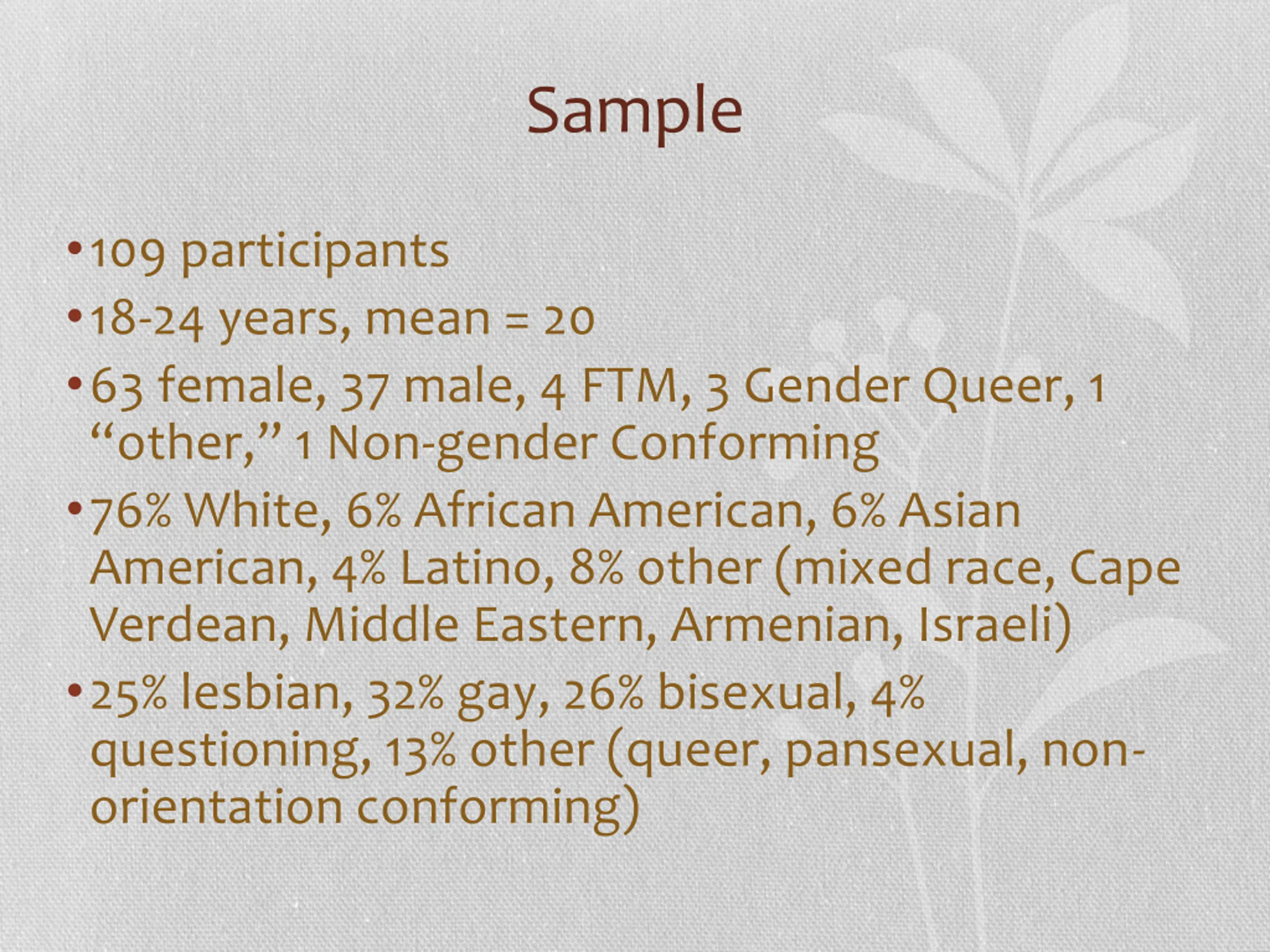 Sample 109 participants 18-24 years, mean = 20 63 female, 37 male, 4 FTM, 3 Gender Queer, 1 other, 1 Non-gender Conforming 76% White, 6% African American, 6% Asian American, 4% Latino, 8% other (mixed race, Cape Verdean, Middle Eastern, Armenian, Israeli) 25% lesbian, 32% gay, 26% bisexual, 4% questioning, 13% other (queer, pansexual, non- orientation conforming)