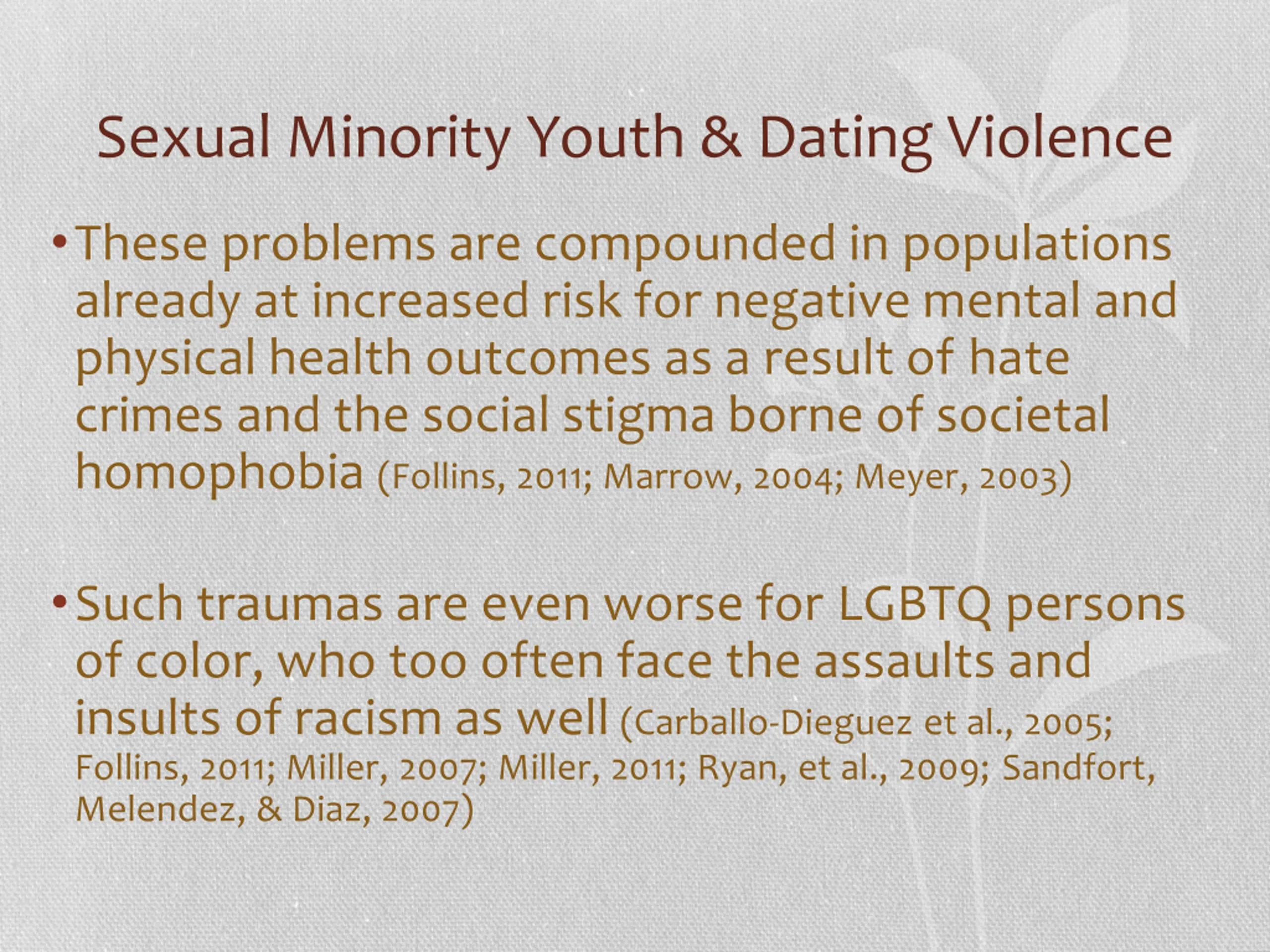 Sexual Minority Youth & Dating Violence These problems are compounded in populations already at increased risk for negative mental and physical health outcomes as a result of hate crimes and the social stigma borne of societal homophobia (Follins, 2011; Marrow, 2004; Meyer, 2003) Such traumas are even worse for LGBTQ persons of color, who too often face the assaults and insults of racism as well (Carballo-Dieguez et al., 2005; Follins, 2011; Miller, 2007; Miller, 2011; Ryan, et al., 2009; Sandfort, Melendez, & Diaz, 2007)