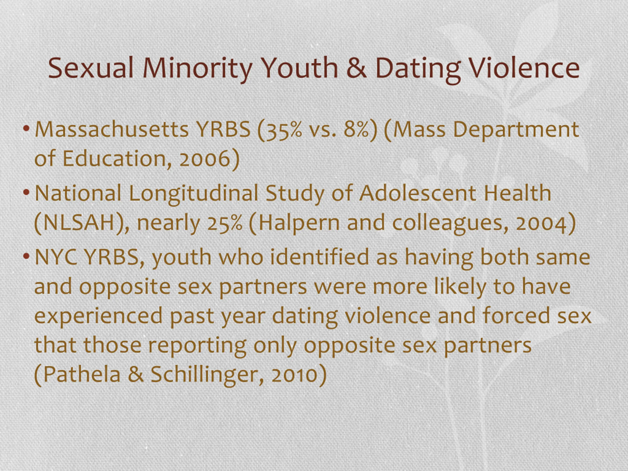 Sexual Minority Youth & Dating Violence Massachusetts YRBS (35% vs. 8%) (Mass Department of Education, 2006) National Longitudinal Study of Adolescent Health (NLSAH), nearly 25% (Halpern and colleagues, 2004) NYC YRBS, youth who identified as having both same and opposite sex partners were more likely to have experienced past year dating violence and forced sex that those reporting only opposite sex partners (Pathela & Schillinger, 2010)