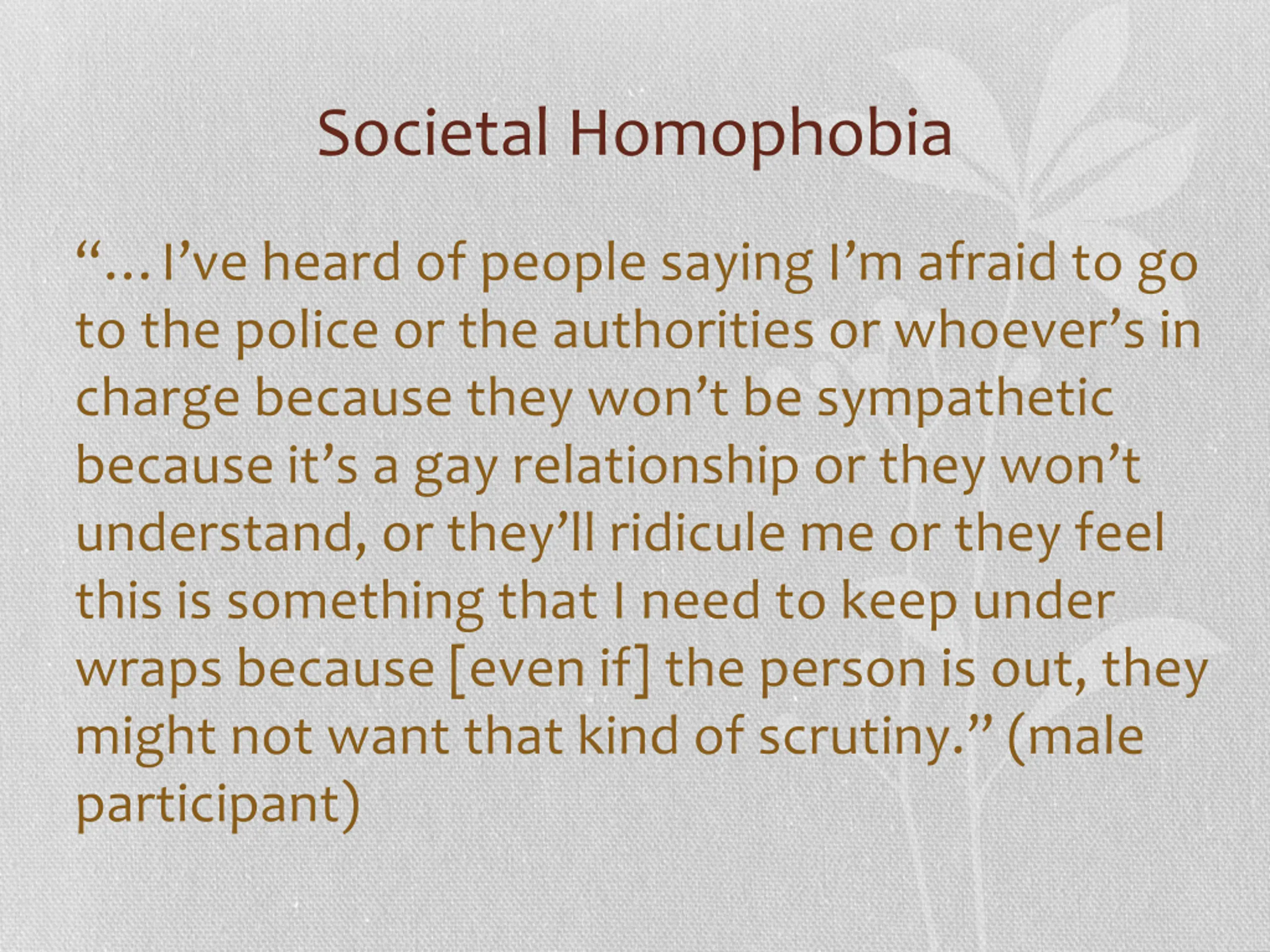 Societal Homophobia I ve heard of people saying I m afraid to go to the police or the authorities or whoever s in charge because they won t be sympathetic because it s a gay relationship or they won t understand, or they ll ridicule me or they feel this is something that I need to keep under wraps because [even if] the person is out, they might not want that kind of scrutiny. (male participant)