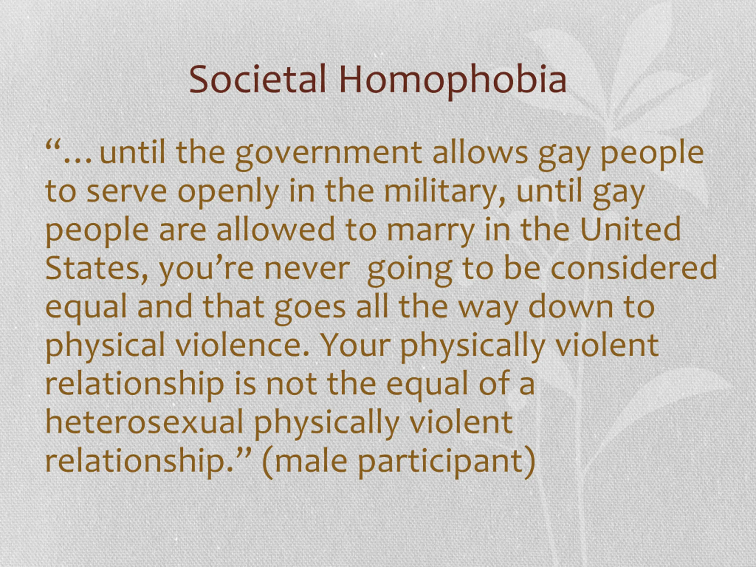 Societal Homophobia until the government allows gay people to serve openly in the military, until gay people are allowed to marry in the United States, you re never going to be considered equal and that goes all the way down to physical violence. Your physically violent relationship is not the equal of a heterosexual physically violent relationship. (male participant)