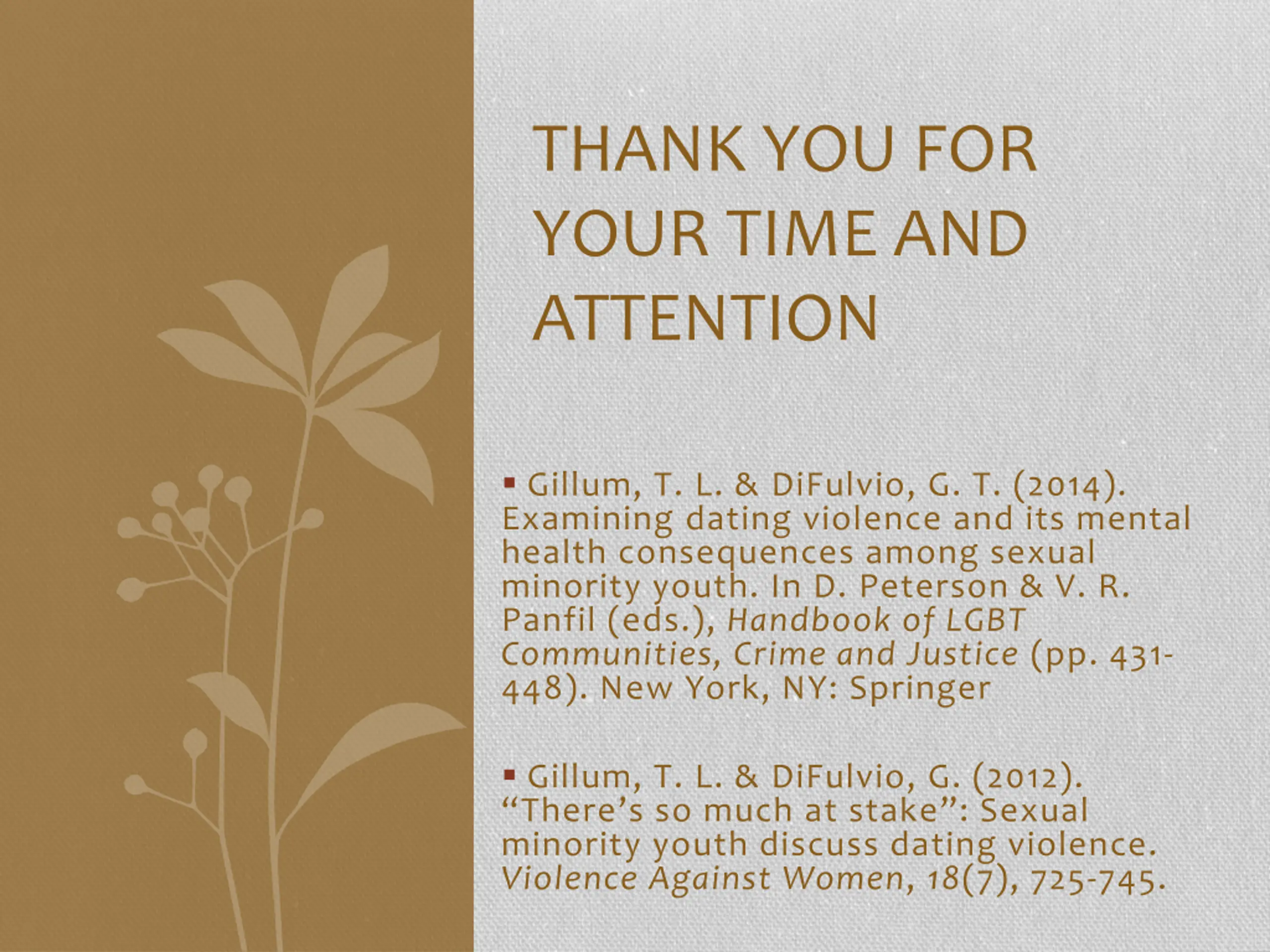 THANK YOU FOR YOUR TIME AND ATTENTION Gillum, T. L. & DiFulvio, G. T. (2014). Examining dating violence and its mental health consequences among sexual minority youth. In D. Peterson & V. R. Panfil (eds.), Handbook of LGBT Communities, Crime and Justice (pp. 431- 448). New York, NY: Springer Gillum, T. L. & DiFulvio, G. (2012). There s so much at stake : Sexual minority youth discuss dating violence. Violence Against Women, 18(7), 725-745.