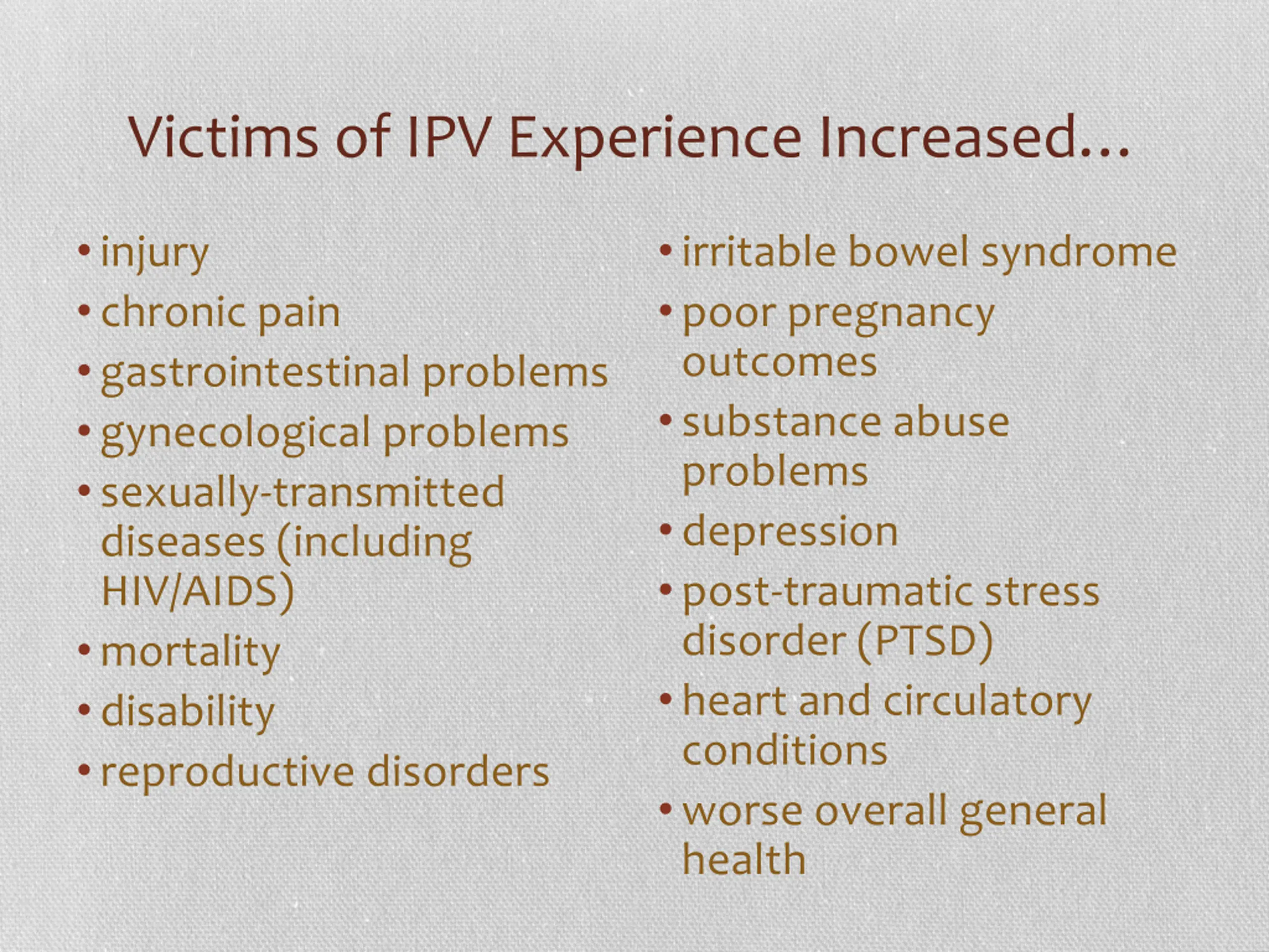 Victims of IPV Experience Increased injury chronic pain gastrointestinal problems gynecological problems sexually-transmitted diseases (including HIV/AIDS) mortality disability reproductive disorders irritable bowel syndrome poor pregnancy outcomes substance abuse problems depression post-traumatic stress disorder (PTSD) heart and circulatory conditions worse overall general health