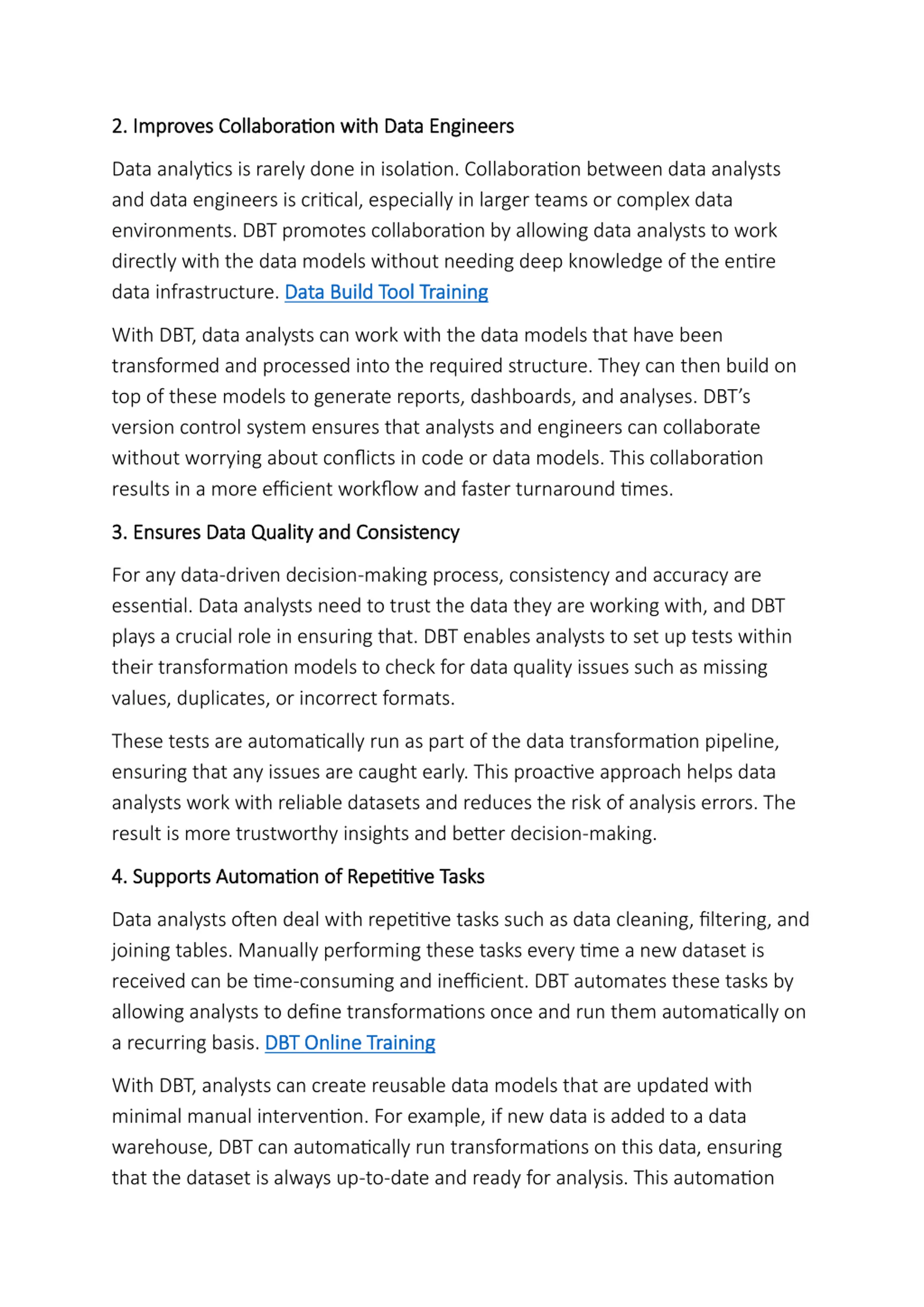 2. Improves Collaboration with Data Engineers 2. Improves Collaboration with Data Engineers Data analytics is rarely done in isolation. Collaboration between data analysts and data engineers is critical, especially in larger teams or complex data environments. DBT promotes collaboration by allowing data analysts to work directly with the data models without needing deep knowledge of the entire data infrastructure. Data Build Tool Training Data Build Tool Training With DBT, data analysts can work with the data models that have been transformed and processed into the required structure. They can then build on top of these models to generate reports, dashboards, and analyses. DBT s version control system ensures that analysts and engineers can collaborate without worrying about conflicts in code or data models. This collaboration results in a more efficient workflow and faster turnaround times. 3. Ensures Data Quality and Consistency 3. Ensures Data Quality and Consistency For any data-driven decision-making process, consistency and accuracy are essential. Data analysts need to trust the data they are working with, and DBT plays a crucial role in ensuring that. DBT enables analysts to set up tests within their transformation models to check for data quality issues such as missing values, duplicates, or incorrect formats. These tests are automatically run as part of the data transformation pipeline, ensuring that any issues are caught early. This proactive approach helps data analysts work with reliable datasets and reduces the risk of analysis errors. The result is more trustworthy insights and better decision-making. 4. Supports Automation of Repetitive Tasks 4. Supports Automation of Repetitive Tasks Data analysts often deal with repetitive tasks such as data cleaning, filtering, and joining tables. Manually performing these tasks every time a new dataset is received can be time-consuming and inefficient. DBT automates these tasks by allowing analysts to define transformations once and run them automatically on a recurring basis. DBT Online Training DBT Online Training With DBT, analysts can create reusable data models that are updated with minimal manual intervention. For example, if new data is added to a data warehouse, DBT can automatically run transformations on this data, ensuring that the dataset is always up-to-date and ready for analysis. This automation