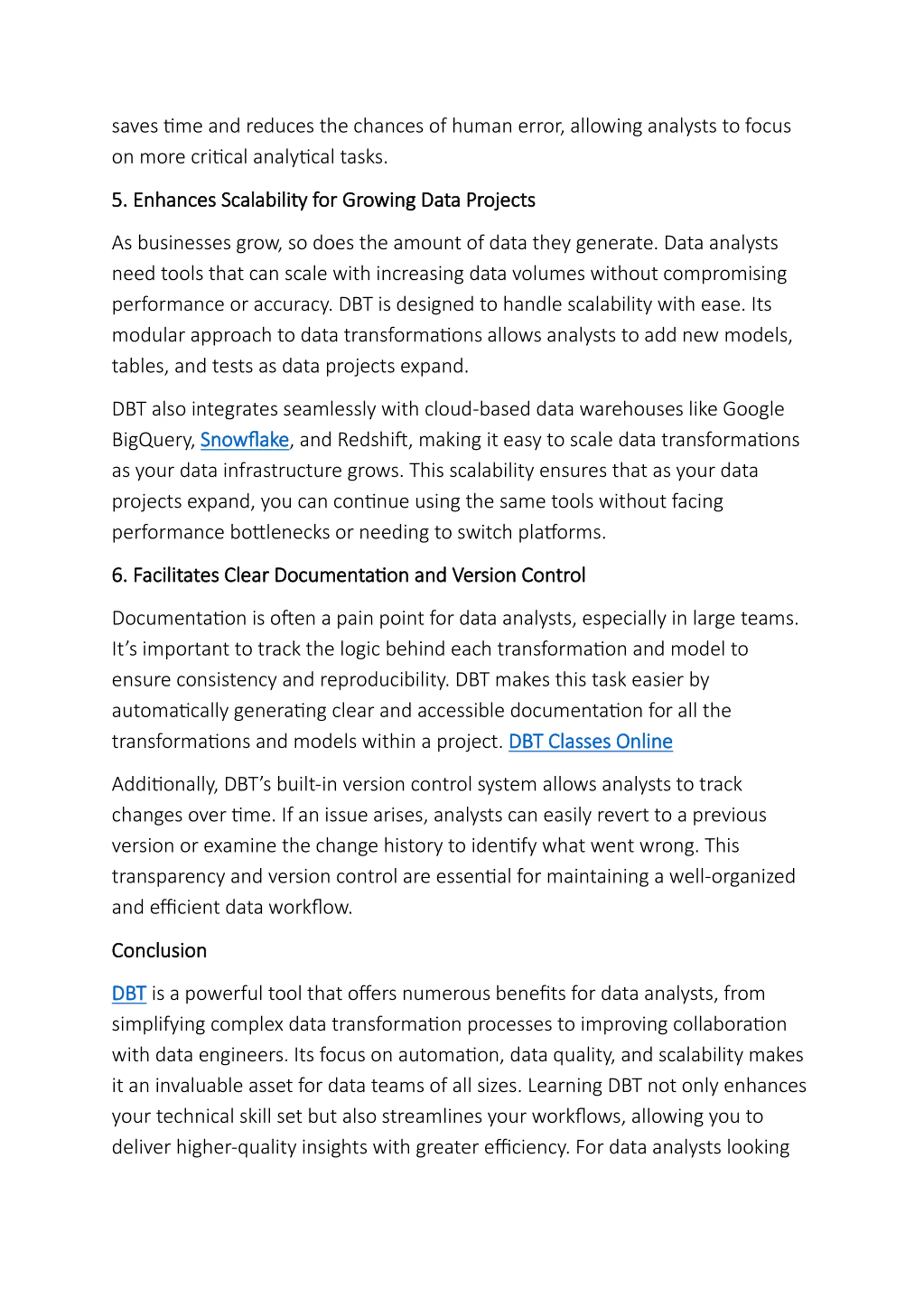 saves time and reduces the chances of human error, allowing analysts to focus on more critical analytical tasks. 5. Enhances Scalability for Growing Data Projects 5. Enhances Scalability for Growing Data Projects As businesses grow, so does the amount of data they generate. Data analysts need tools that can scale with increasing data volumes without compromising performance or accuracy. DBT is designed to handle scalability with ease. Its modular approach to data transformations allows analysts to add new models, tables, and tests as data projects expand. DBT also integrates seamlessly with cloud-based data warehouses like Google BigQuery, Snowflake Snowflake, and Redshift, making it easy to scale data transformations as your data infrastructure grows. This scalability ensures that as your data projects expand, you can continue using the same tools without facing performance bottlenecks or needing to switch platforms. 6. Facilitates Clear Documentation and Version Control 6. Facilitates Clear Documentation and Version Control Documentation is often a pain point for data analysts, especially in large teams. It s important to track the logic behind each transformation and model to ensure consistency and reproducibility. DBT makes this task easier by automatically generating clear and accessible documentation for all the transformations and models within a project. DBT Classes Online DBT Classes Online Additionally, DBT s built-in version control system allows analysts to track changes over time. If an issue arises, analysts can easily revert to a previous version or examine the change history to identify what went wrong. This transparency and version control are essential for maintaining a well-organized and efficient data workflow. Conclusion Conclusion DBT DBT is a powerful tool that offers numerous benefits for data analysts, from simplifying complex data transformation processes to improving collaboration with data engineers. Its focus on automation, data quality, and scalability makes it an invaluable asset for data teams of all sizes. Learning DBT not only enhances your technical skill set but also streamlines your workflows, allowing you to deliver higher-quality insights with greater efficiency. For data analysts looking