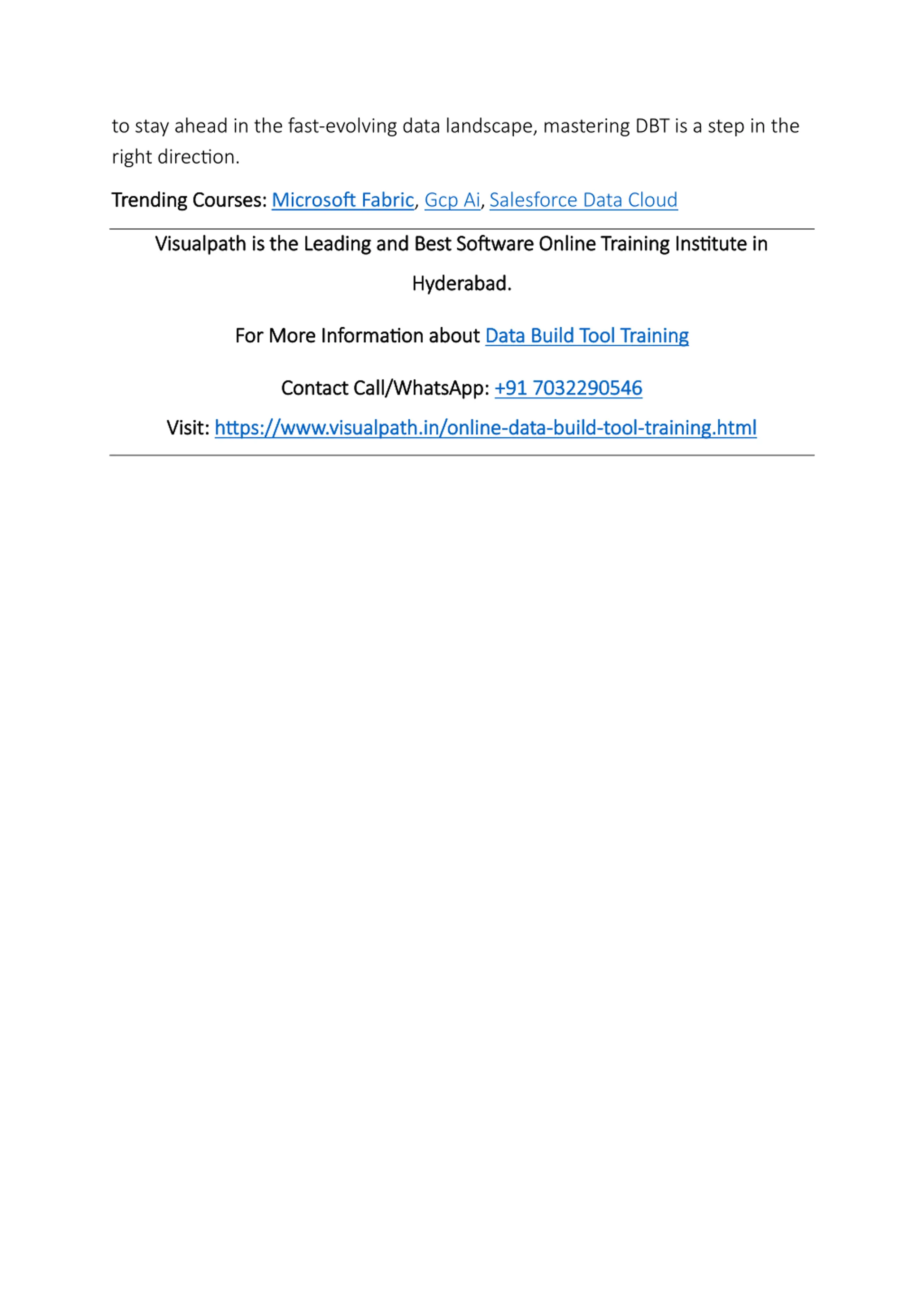 to stay ahead in the fast-evolving data landscape, mastering DBT is a step in the right direction. Trending Trending Courses Courses: :Microsoft Fabric, Gcp Ai, Salesforce Data Cloud Visualpath is the Leading and Best Software Online Training Institute in Visualpath is the Leading and Best Software Online Training Institute in Hyderabad. Hyderabad. For More Information about For More Information about Data Build Tool Training Data Build Tool Training Contact Call/WhatsApp: Contact Call/WhatsApp: +91 7032290546 +91 7032290546 Visit: Visit: https://www.visualpath.in/online https://www.visualpath.in/online- -data data- -build build- -tool tool- -training.html training.html