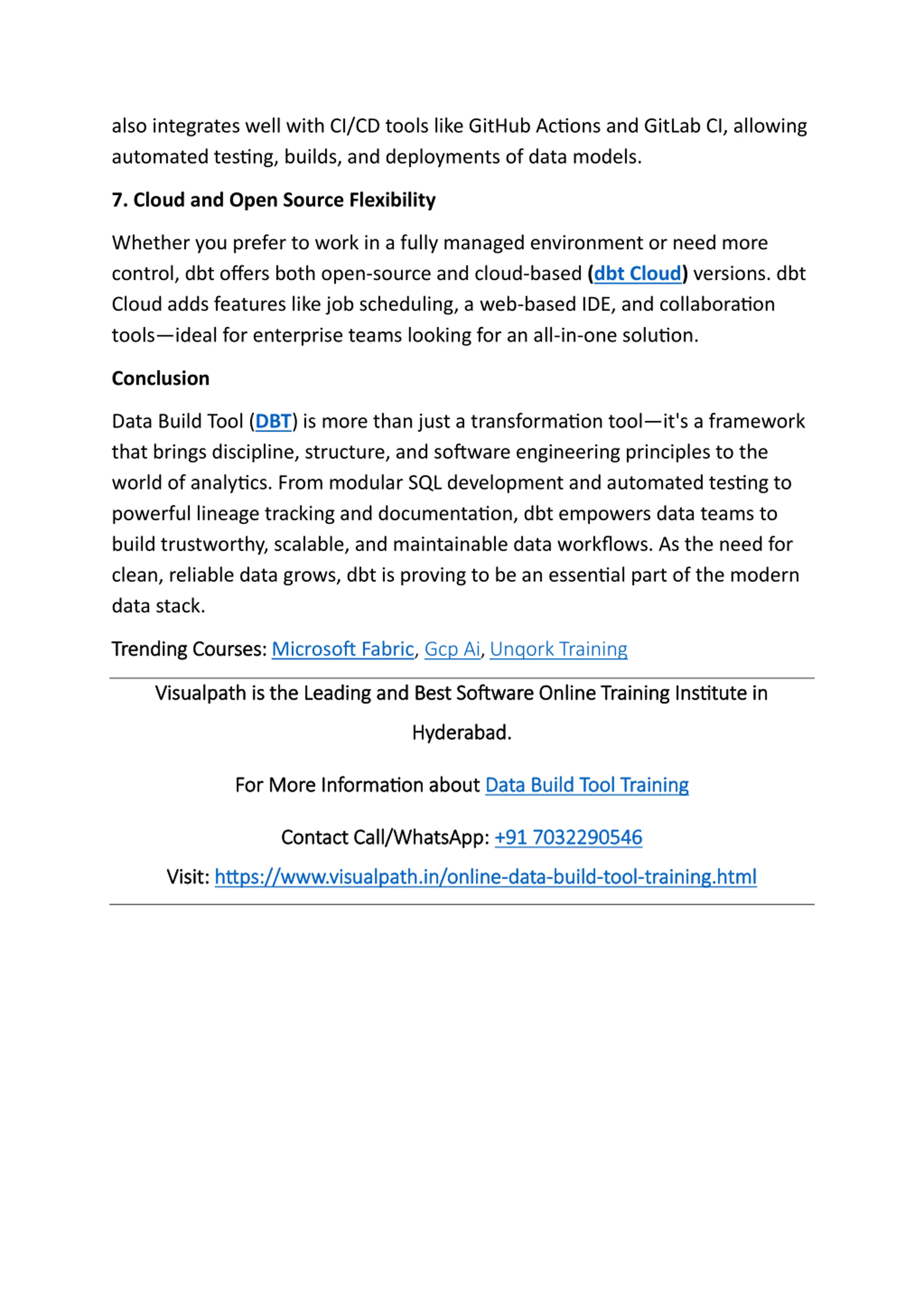 also integrates well with CI/CD tools like GitHub Actions and GitLab CI, allowing automated testing, builds, and deployments of data models. 7. Cloud and Open Source Flexibility Whether you prefer to work in a fully managed environment or need more control, dbt offers both open-source and cloud-based (dbt Cloud) versions. dbt Cloud adds features like job scheduling, a web-based IDE, and collaboration tools ideal for enterprise teams looking for an all-in-one solution. Conclusion Data Build Tool (DBT) is more than just a transformation tool it's a framework that brings discipline, structure, and software engineering principles to the world of analytics. From modular SQL development and automated testing to powerful lineage tracking and documentation, dbt empowers data teams to build trustworthy, scalable, and maintainable data workflows. As the need for clean, reliable data grows, dbt is proving to be an essential part of the modern data stack. Trending Trending Courses Courses: :Microsoft Fabric, Gcp Ai, Unqork Training Visualpath is the Leading and Best Software Online Training Institute in Visualpath is the Leading and Best Software Online Training Institute in Hyderabad. Hyderabad. For More Information about For More Information about Data Build Tool Training Data Build Tool Training Contact Call/WhatsApp: Contact Call/WhatsApp: +91 7032290546 +91 7032290546 Visit: Visit: https://www.visualpath.in/online https://www.visualpath.in/online- -data data- -build build- -tool tool- -training.html training.html