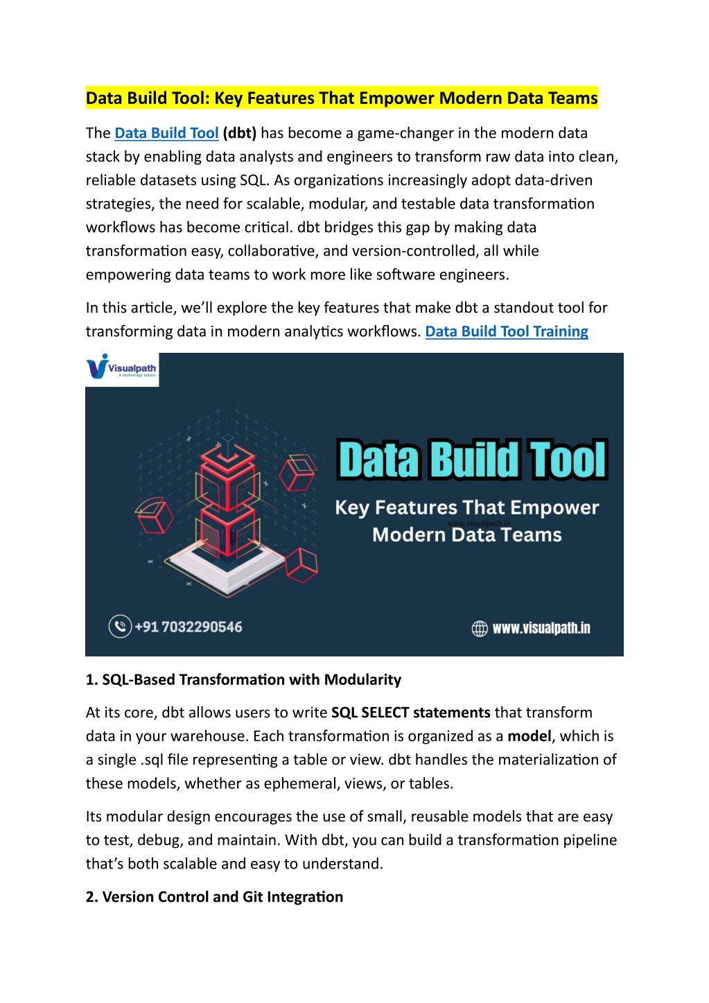 Data Build Tool: Key Features That Empower Modern Data Teams The Data Build Tool (dbt) has become a game-changer in the modern data stack by enabling data analysts and engineers to transform raw data into clean, reliable datasets using SQL. As organizations increasingly adopt data-driven strategies, the need for scalable, modular, and testable data transformation workflows has become critical. dbt bridges this gap by making data transformation easy, collaborative, and version-controlled, all while empowering data teams to work more like software engineers. In this article, we ll explore the key features that make dbt a standout tool for transforming data in modern analytics workflows. Data Build Tool Training 1. SQL-Based Transformation with Modularity At its core, dbt allows users to write SQL SELECT statements that transform data in your warehouse. Each transformation is organized as a model, which is a single .sql file representing a table or view. dbt handles the materialization of these models, whether as ephemeral, views, or tables. Its modular design encourages the use of small, reusable models that are easy to test, debug, and maintain. With dbt, you can build a transformation pipeline that s both scalable and easy to understand. 2. Version Control and Git Integration