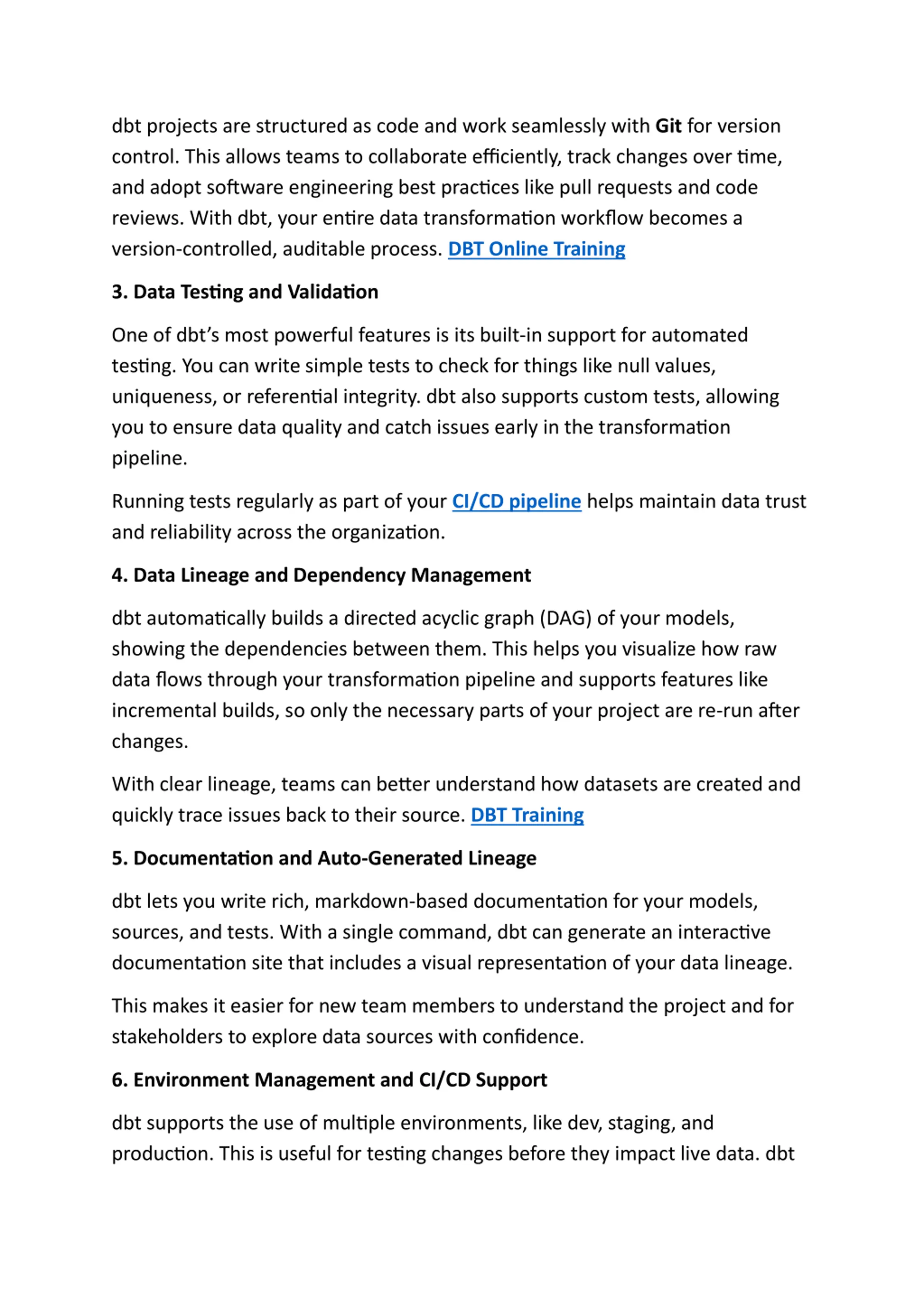 dbt projects are structured as code and work seamlessly with Git for version control. This allows teams to collaborate efficiently, track changes over time, and adopt software engineering best practices like pull requests and code reviews. With dbt, your entire data transformation workflow becomes a version-controlled, auditable process. DBT Online Training 3. Data Testing and Validation One of dbt s most powerful features is its built-in support for automated testing. You can write simple tests to check for things like null values, uniqueness, or referential integrity. dbt also supports custom tests, allowing you to ensure data quality and catch issues early in the transformation pipeline. Running tests regularly as part of your CI/CD pipeline helps maintain data trust and reliability across the organization. 4. Data Lineage and Dependency Management dbt automatically builds a directed acyclic graph (DAG) of your models, showing the dependencies between them. This helps you visualize how raw data flows through your transformation pipeline and supports features like incremental builds, so only the necessary parts of your project are re-run after changes. With clear lineage, teams can better understand how datasets are created and quickly trace issues back to their source. DBT Training 5. Documentation and Auto-Generated Lineage dbt lets you write rich, markdown-based documentation for your models, sources, and tests. With a single command, dbt can generate an interactive documentation site that includes a visual representation of your data lineage. This makes it easier for new team members to understand the project and for stakeholders to explore data sources with confidence. 6. Environment Management and CI/CD Support dbt supports the use of multiple environments, like dev, staging, and production. This is useful for testing changes before they impact live data. dbt