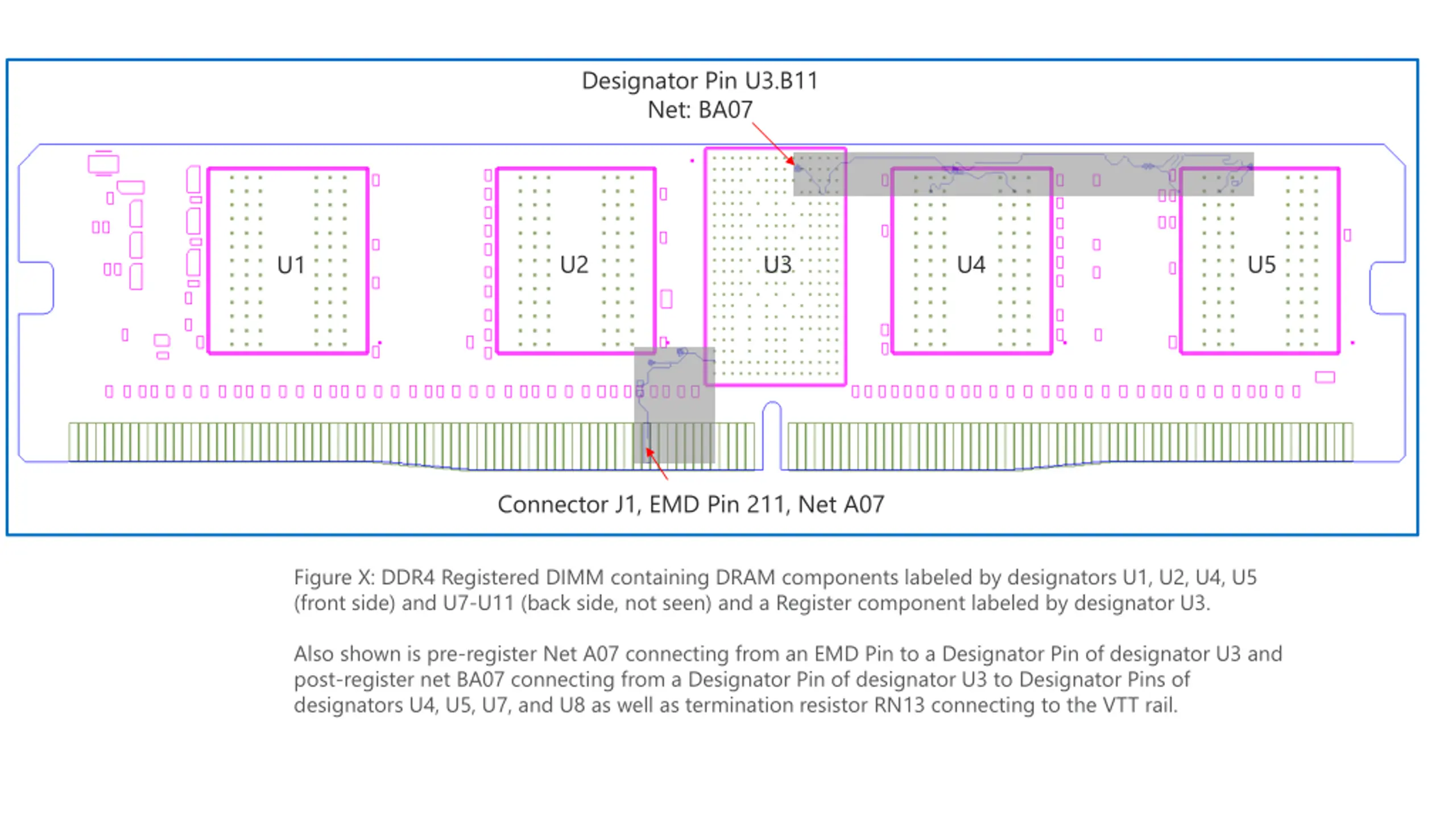 Designator Pin U3.B11 Net: BA07 U3 U4 U5 U2 U1 Connector J1, EMD Pin 211, Net A07 Figure X: DDR4 Registered DIMM containing DRAM components labeled by designators U1, U2, U4, U5 (front side) and U7-U11 (back side, not seen) and a Register component labeled by designator U3. Also shown is pre-register Net A07 connecting from an EMD Pin to a Designator Pin of designator U3 and post-register net BA07 connecting from a Designator Pin of designator U3 to Designator Pins of designators U4, U5, U7, and U8 as well as termination resistor RN13 connecting to the VTT rail.