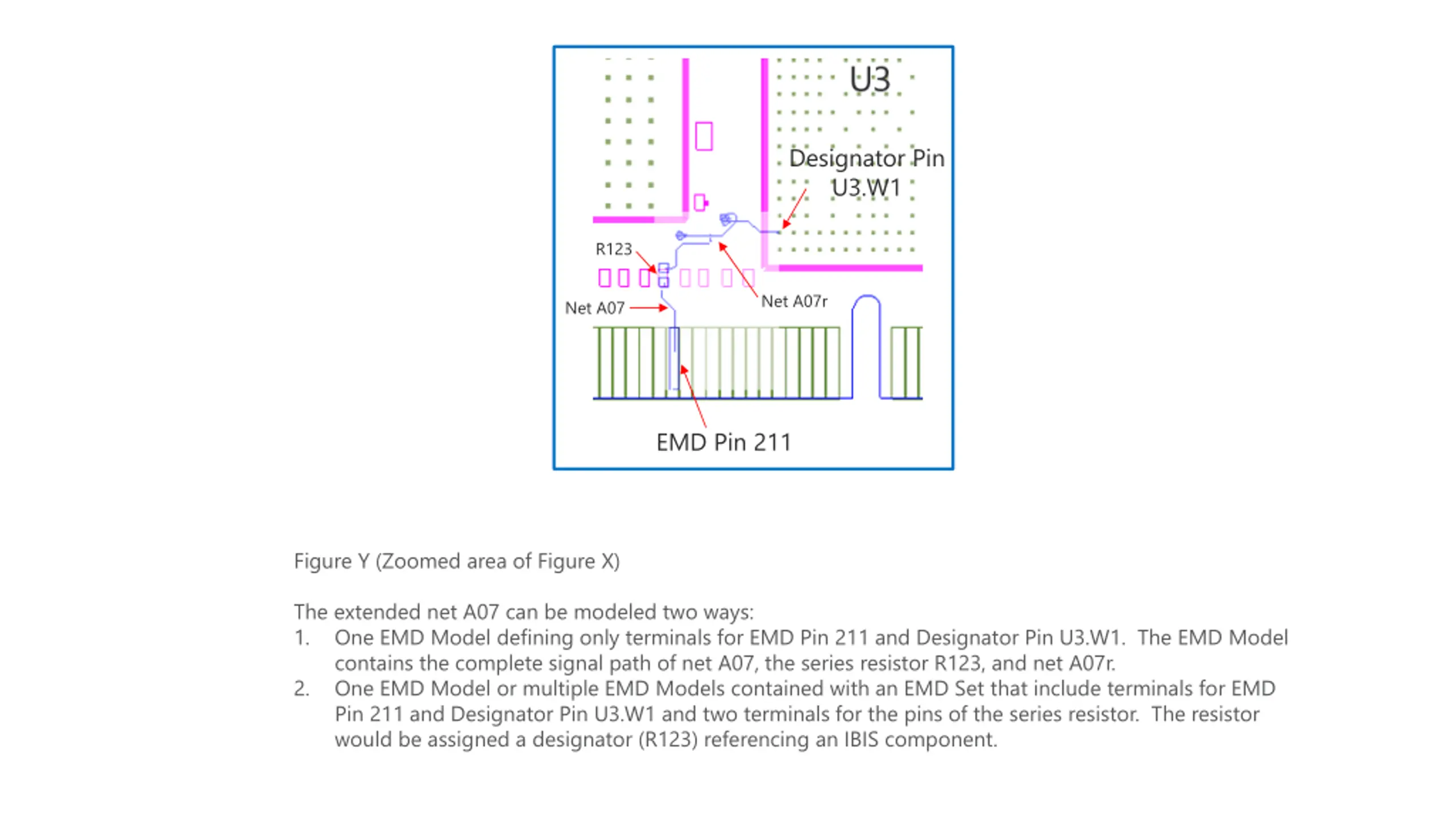 Designator Pin U3.W1 R123 Net A07r Net A07 EMD Pin 211 Figure Y (Zoomed area of Figure X) The extended net A07 can be modeled two ways: 1. One EMD Model defining only terminals for EMD Pin 211 and Designator Pin U3.W1. The EMD Model contains the complete signal path of net A07, the series resistor R123, and net A07r. 2. One EMD Model or multiple EMD Models contained with an EMD Set that include terminals for EMD Pin 211 and Designator Pin U3.W1 and two terminals for the pins of the series resistor. The resistor would be assigned a designator (R123) referencing an IBIS component.