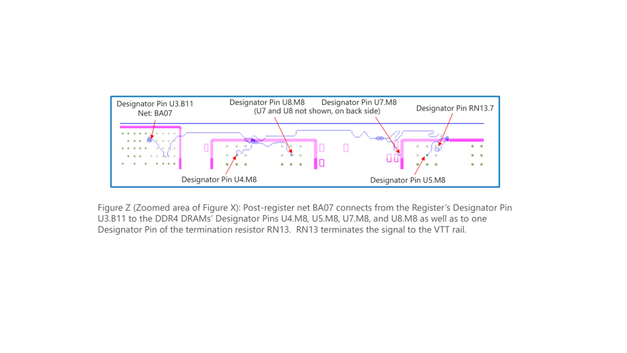 Designator Pin U8.M8 (U7 and U8 not shown, on back side) Designator Pin U7.M8 Designator Pin U3.B11 Net: BA07 Designator Pin RN13.7 Designator Pin U4.M8 Designator Pin U5.M8 Figure Z (Zoomed area of Figure X): Post-register net BA07 connects from the Register s Designator Pin U3.B11 to the DDR4 DRAMs Designator Pins U4.M8, U5.M8, U7.M8, and U8.M8 as well as to one Designator Pin of the termination resistor RN13. RN13 terminates the signal to the VTT rail.