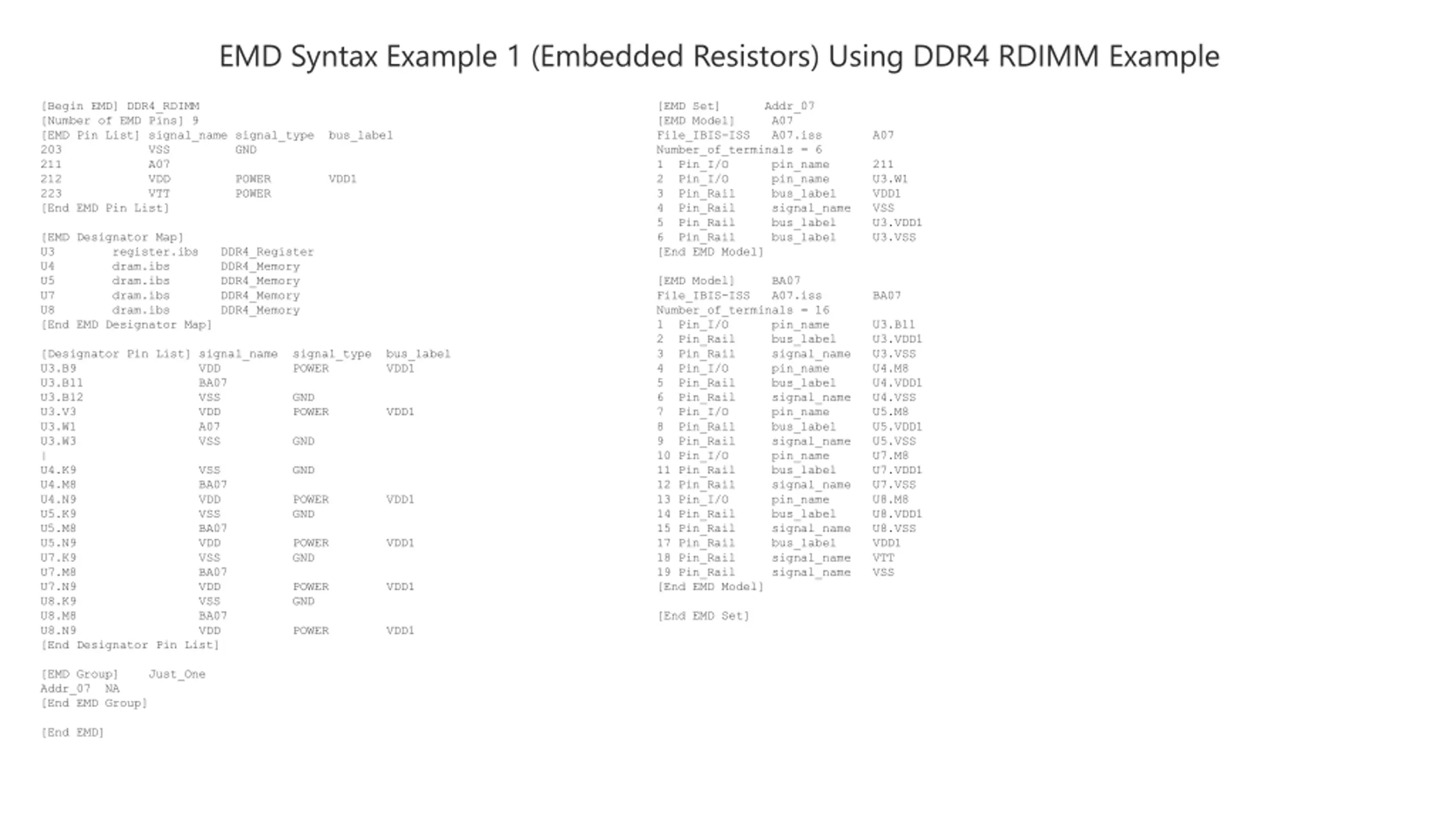 EMD Syntax Example 1 (Embedded Resistors) Using DDR4 RDIMM Example [Begin EMD] DDR4_RDIMM [Number of EMD Pins] 9 [EMD Pin List] signal_name signal_type 203 VSS GND 211 A07 212 VDD 223 VTT POWER [End EMD Pin List] [EMD Set] Addr_07 [EMD Model] A07 File_IBIS-ISS A07.iss A07 Number_of_terminals = 6 1 Pin_I/O pin_name 2 Pin_I/O pin_name 3 Pin_Rail bus_label 4 Pin_Rail signal_name 5 Pin_Rail bus_label 6 Pin_Rail bus_label [End EMD Model] bus_label 211 U3.W1 VDD1 VSS U3.VDD1 U3.VSS POWER VDD1 [EMD Designator Map] U3 register.ibs U4 dram.ibs U5 dram.ibs U7 dram.ibs U8 dram.ibs [End EMD Designator Map] DDR4_Register DDR4_Memory DDR4_Memory DDR4_Memory DDR4_Memory [EMD Model] BA07 File_IBIS-ISS A07.iss BA07 Number_of_terminals = 16 1 Pin_I/O pin_name 2 Pin_Rail bus_label 3 Pin_Rail signal_name 4 Pin_I/O pin_name 5 Pin_Rail bus_label 6 Pin_Rail signal_name 7 Pin_I/O pin_name 8 Pin_Rail bus_label 9 Pin_Rail signal_name 10 Pin_I/O pin_name 11 Pin_Rail bus_label 12 Pin_Rail signal_name 13 Pin_I/O pin_name 14 Pin_Rail bus_label 15 Pin_Rail signal_name 17 Pin_Rail bus_label 18 Pin_Rail signal_name 19 Pin_Rail signal_name [End EMD Model] U3.B11 U3.VDD1 U3.VSS U4.M8 U4.VDD1 U4.VSS U5.M8 U5.VDD1 U5.VSS U7.M8 U7.VDD1 U7.VSS U8.M8 U8.VDD1 U8.VSS VDD1 VTT VSS [Designator Pin List] signal_name U3.B9 VDD POWER VDD1 U3.B11 BA07 U3.B12 VSS GND U3.V3 VDD POWER VDD1 U3.W1 A07 U3.W3 VSS GND | U4.K9 VSS GND U4.M8 BA07 U4.N9 VDD POWER VDD1 U5.K9 VSS GND U5.M8 BA07 U5.N9 VDD POWER VDD1 U7.K9 VSS GND U7.M8 BA07 U7.N9 VDD POWER VDD1 U8.K9 VSS GND U8.M8 BA07 U8.N9 VDD POWER VDD1 [End Designator Pin List] signal_type bus_label [End EMD Set] [EMD Group] Just_One Addr_07 NA [End EMD Group] [End EMD]