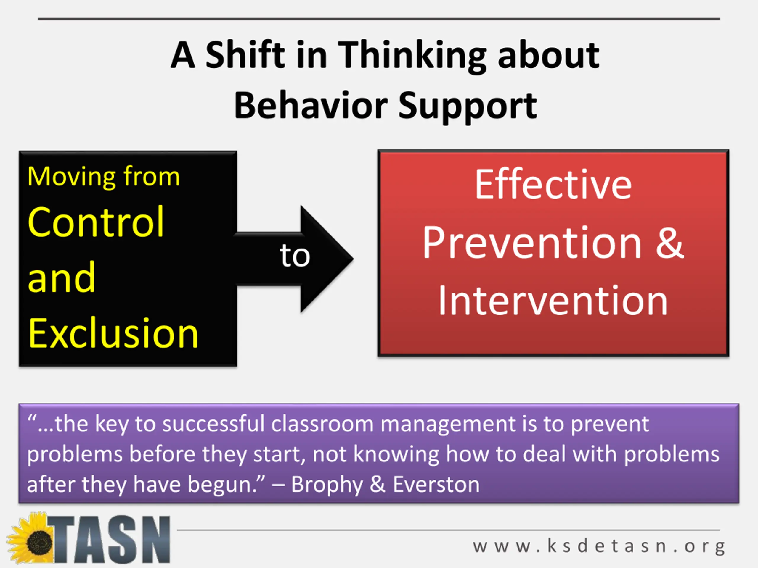 A Shift in Thinking about Behavior Support Moving from Control and Exclusion Effective Prevention & Intervention to the key to successful classroom management is to prevent problems before they start, not knowing how to deal with problems after they have begun. Brophy & Everston w w w . k s d e t a s n . o r g