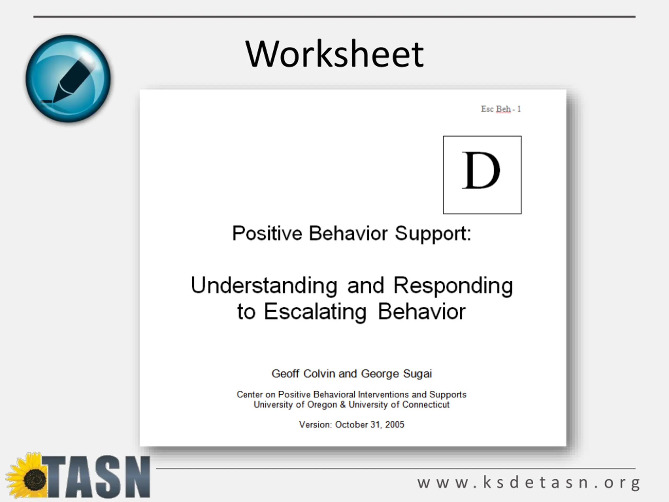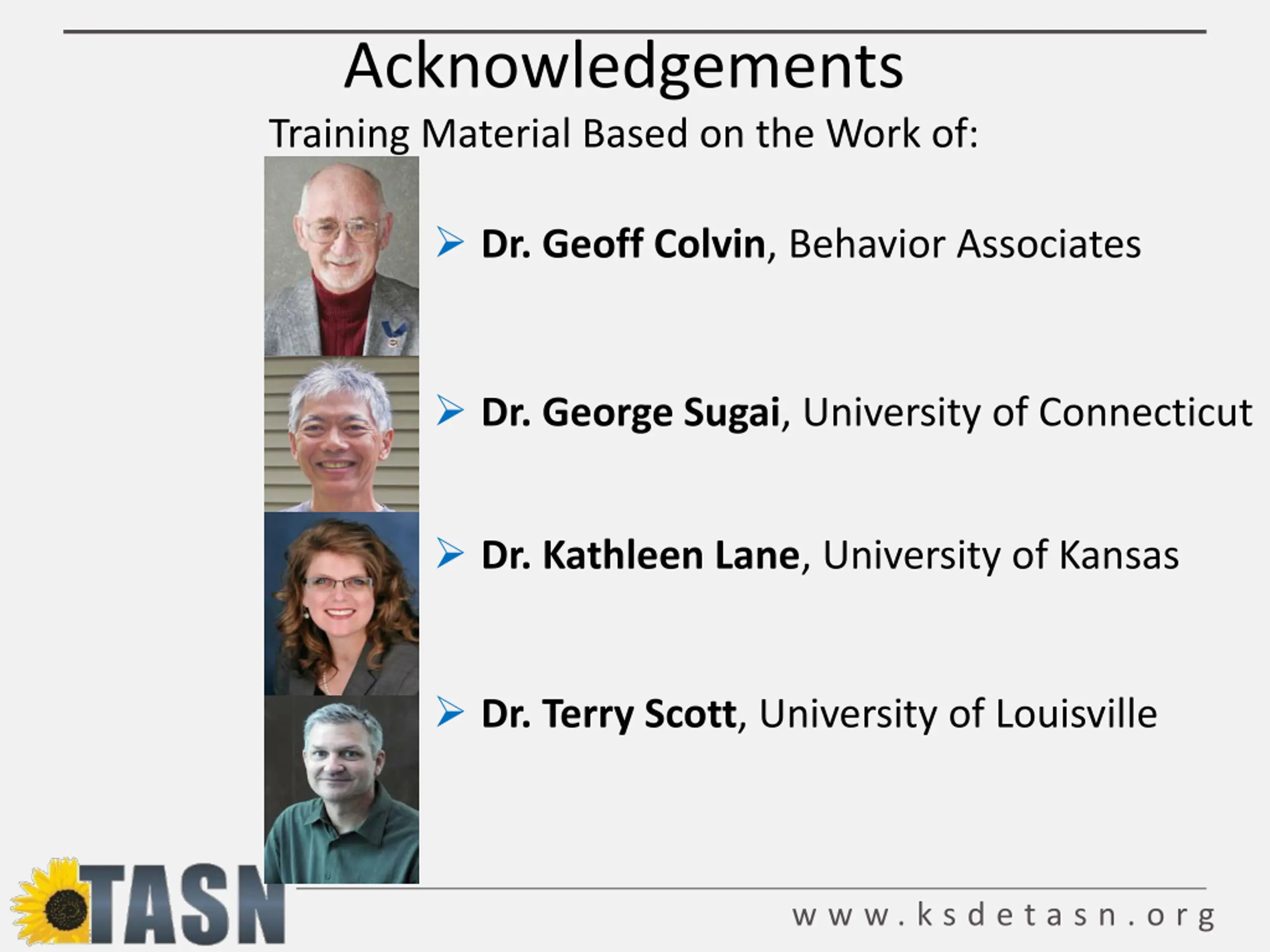 Acknowledgements Training Material Based on the Work of: Dr. Geoff Colvin, Behavior Associates Dr. George Sugai, University of Connecticut Dr. Kathleen Lane, University of Kansas Dr. Terry Scott, University of Louisville w w w . k s d e t a s n . o r g