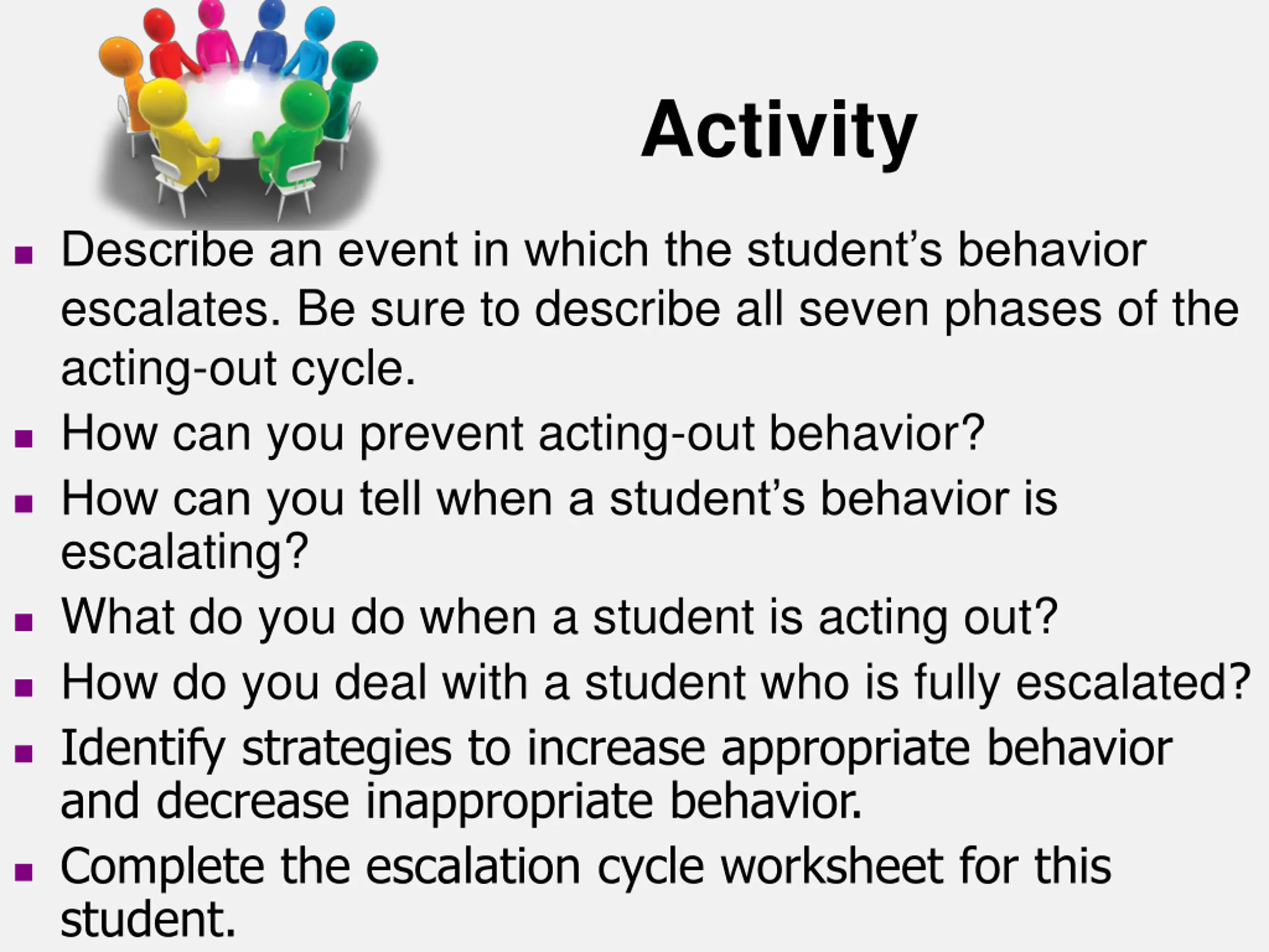 Activity Describe an event in which the student s behavior escalates. Be sure to describe all seven phases of the acting-out cycle. How can you prevent acting-out behavior? How can you tell when a student s behavior is escalating? What do you do when a student is acting out? How do you deal with a student who is fully escalated? Identify strategies to increase appropriate behavior and decrease inappropriate behavior. Complete the escalation cycle worksheet for this student.