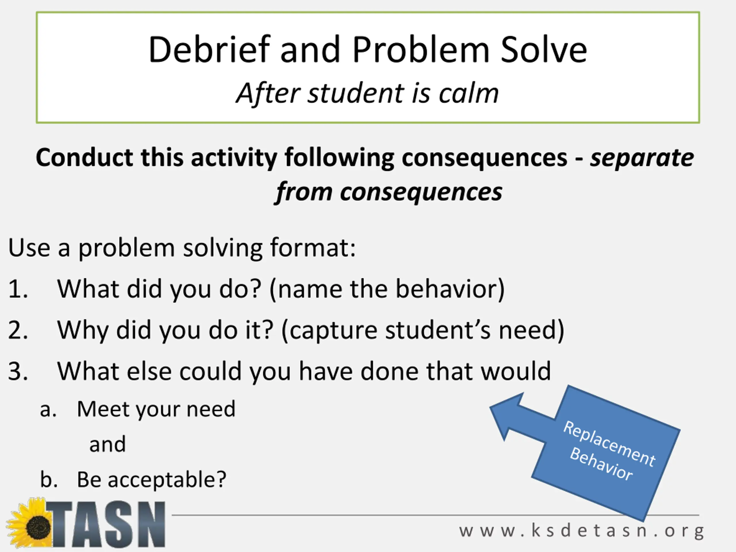 Debrief and Problem Solve After student is calm Conduct this activity following consequences - separate from consequences Use a problem solving format: 1. What did you do? (name the behavior) 2. Why did you do it? (capture student s need) 3. What else could you have done that would a. Meet your need and b. Be acceptable? w w w . k s d e t a s n . o r g