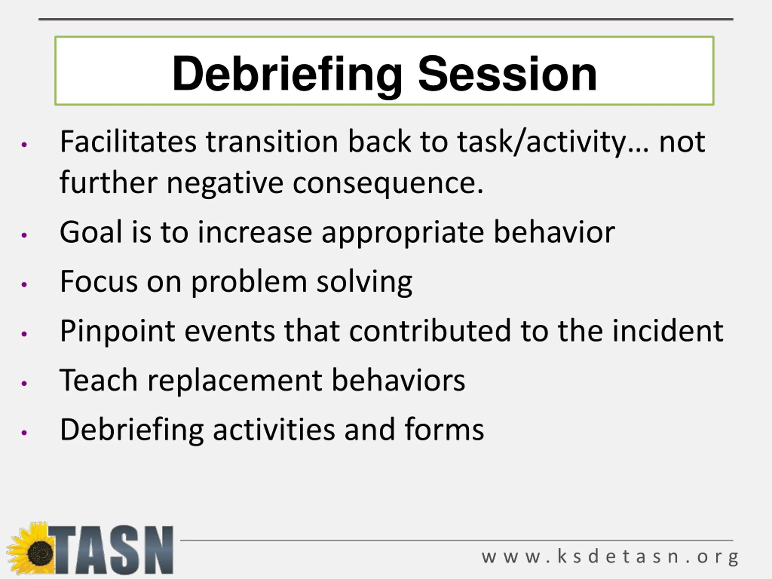 Debriefing Session Facilitates transition back to task/activity not further negative consequence. Goal is to increase appropriate behavior Focus on problem solving Pinpoint events that contributed to the incident Teach replacement behaviors Debriefing activities and forms w w w . k s d e t a s n . o r g