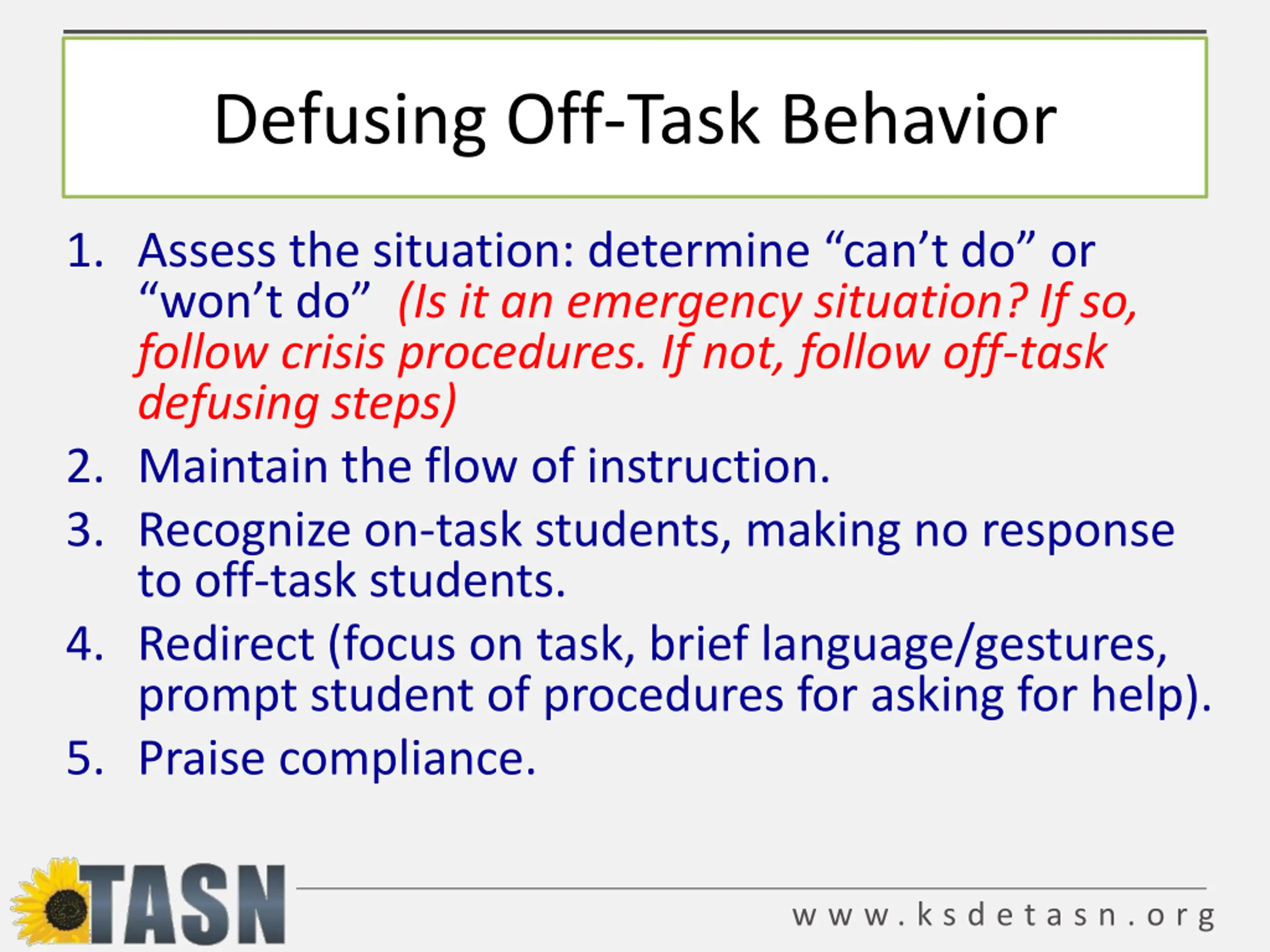 Defusing Off-Task Behavior 1. Assess the situation: determine can t do or won t do (Is it an emergency situation? If so, follow crisis procedures. If not, follow off-task defusing steps) 2. Maintain the flow of instruction. 3. Recognize on-task students, making no response to off-task students. 4. Redirect (focus on task, brief language/gestures, prompt student of procedures for asking for help). 5. Praise compliance. w w w . k s d e t a s n . o r g