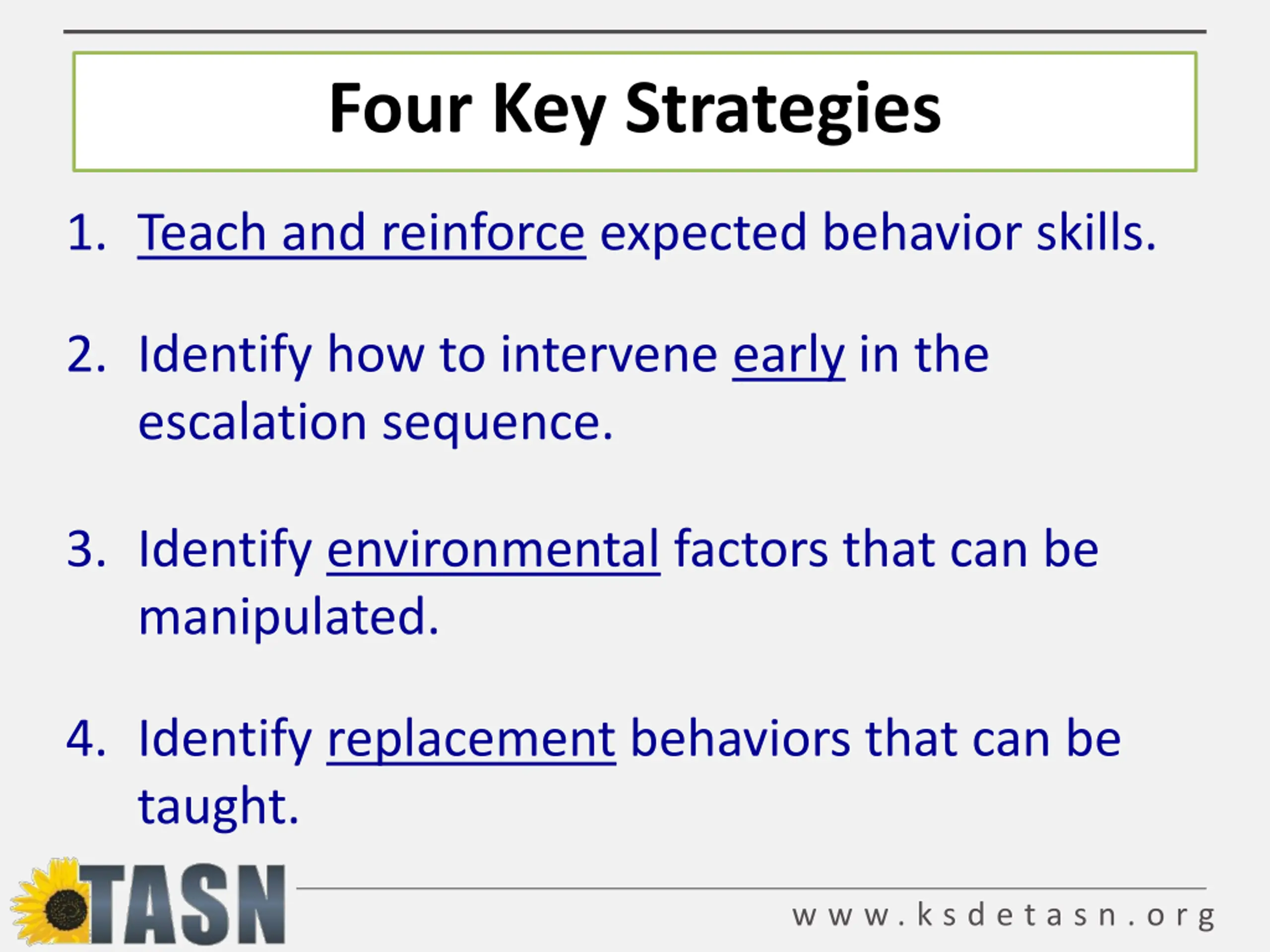 Four Key Strategies 1. Teach and reinforce expected behavior skills. 2. Identify how to intervene early in the escalation sequence. 3. Identify environmental factors that can be manipulated. 4. Identify replacement behaviors that can be taught. w w w . k s d e t a s n . o r g