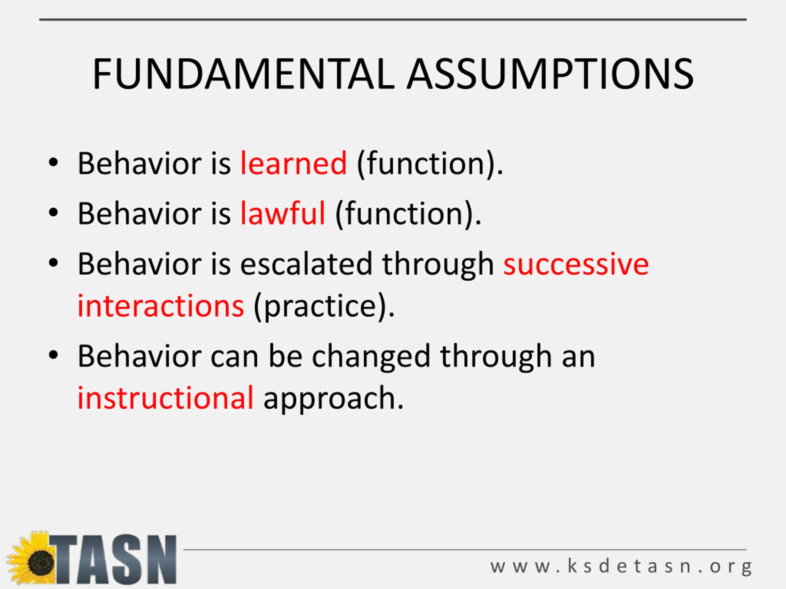 FUNDAMENTAL ASSUMPTIONS Behavior is learned (function). Behavior is lawful (function). Behavior is escalated through successive interactions (practice). Behavior can be changed through an instructional approach. w w w . k s d e t a s n . o r g