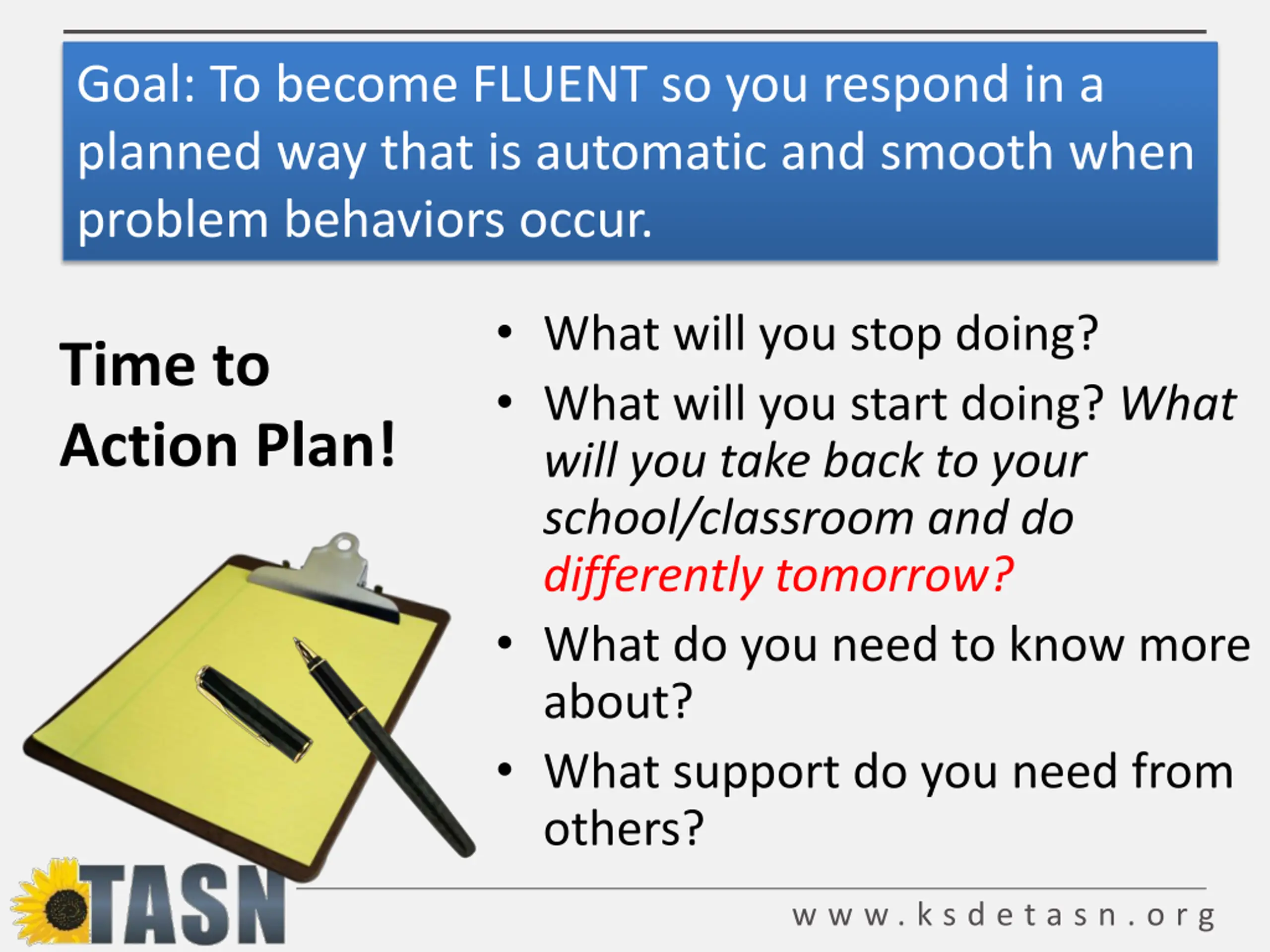 Goal: To become FLUENT so you respond in a planned way that is automatic and smooth when problem behaviors occur. What will you stop doing? What will you start doing? What will you take back to your school/classroom and do differently tomorrow? What do you need to know more about? What support do you need from others? Time to Action Plan! w w w . k s d e t a s n . o r g
