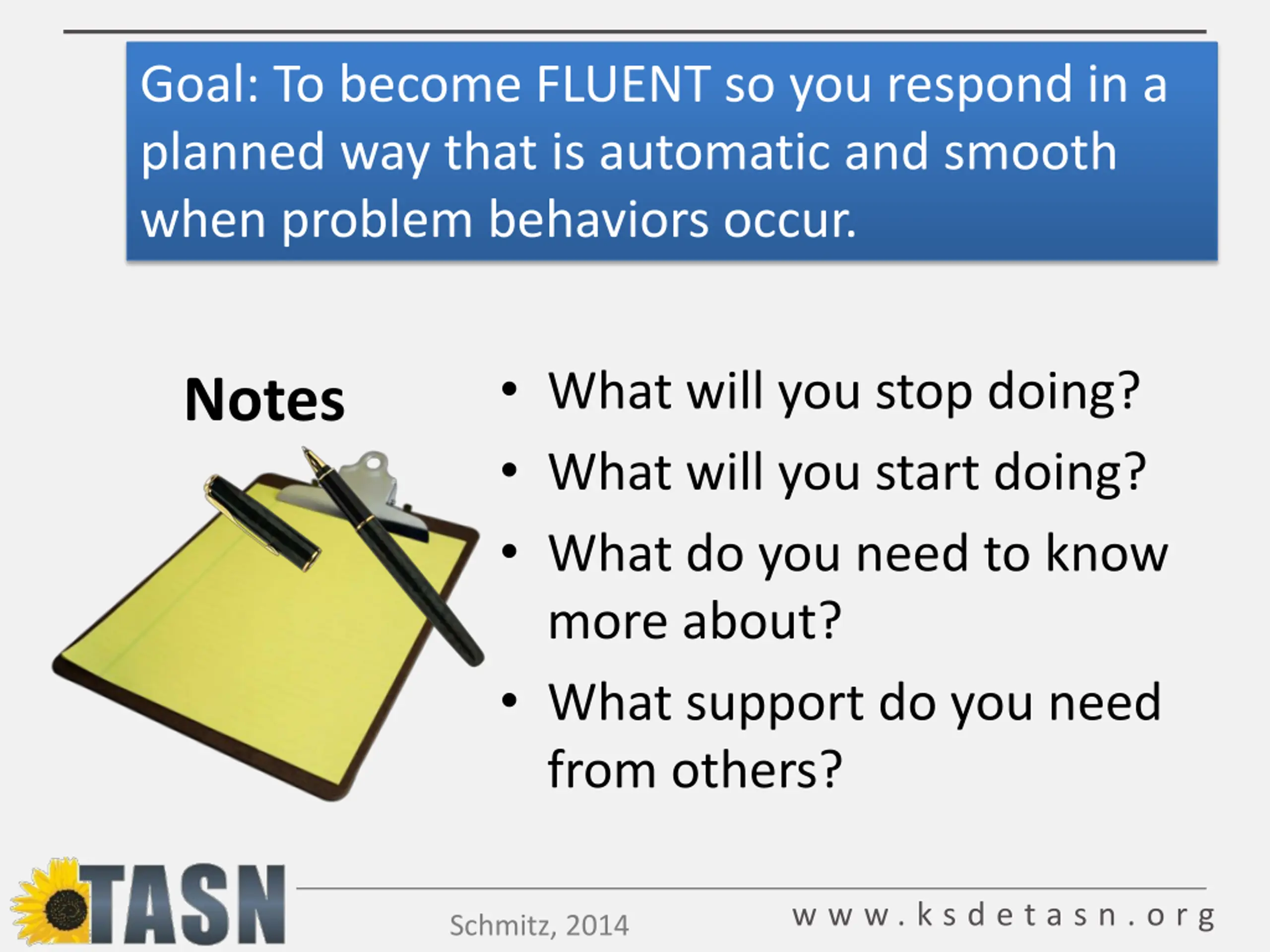 Goal: To become FLUENT so you respond in a planned way that is automatic and smooth when problem behaviors occur. What will you stop doing? What will you start doing? What do you need to know more about? What support do you need from others? Notes w w w . k s d e t a s n . o r g Schmitz, 2014