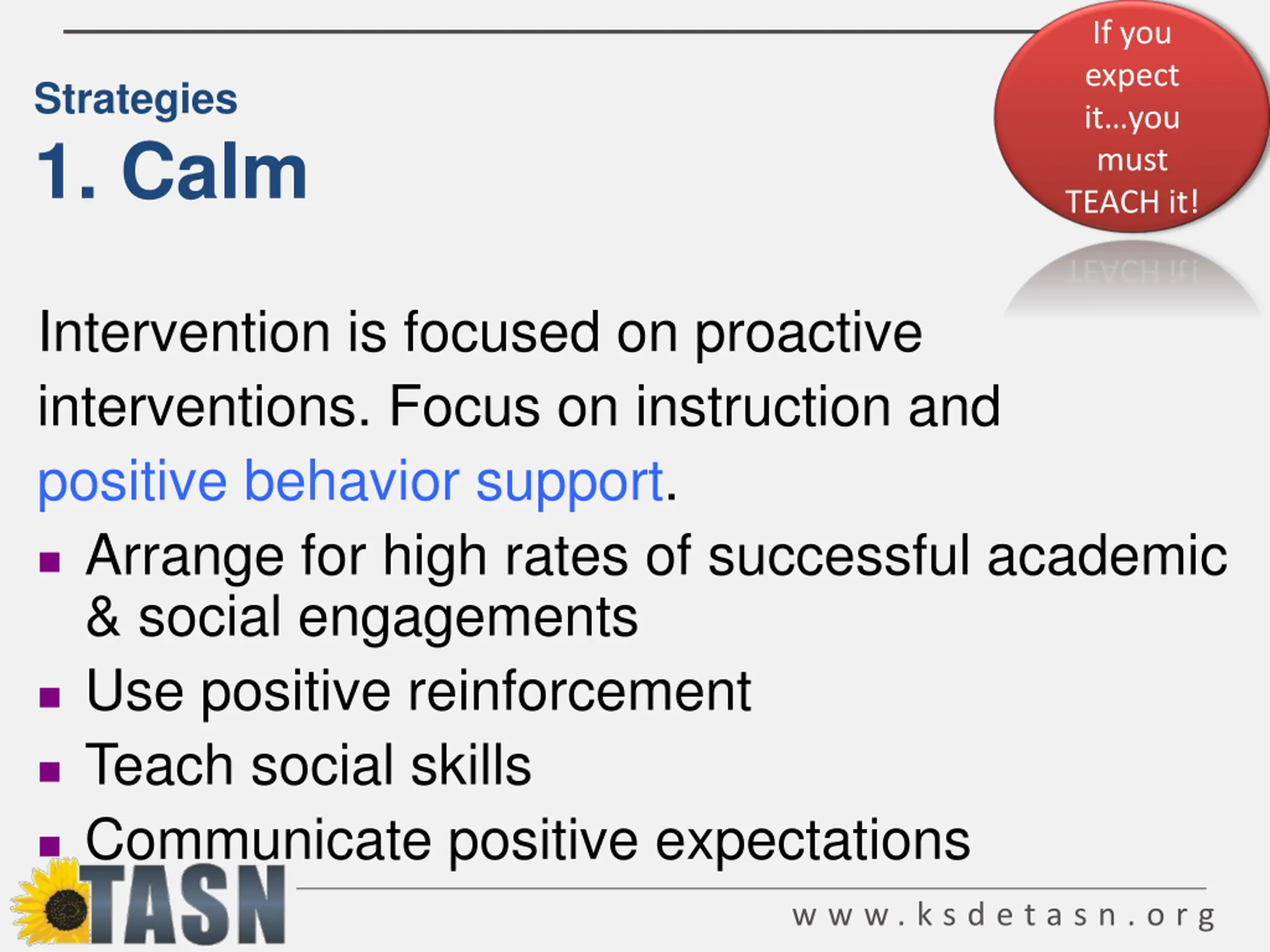 If you expect it you must TEACH it! Strategies 1. Calm Intervention is focused on proactive interventions. Focus on instruction and positive behavior support. Arrange for high rates of successful academic & social engagements Use positive reinforcement Teach social skills Communicate positive expectations w w w . k s d e t a s n . o r g