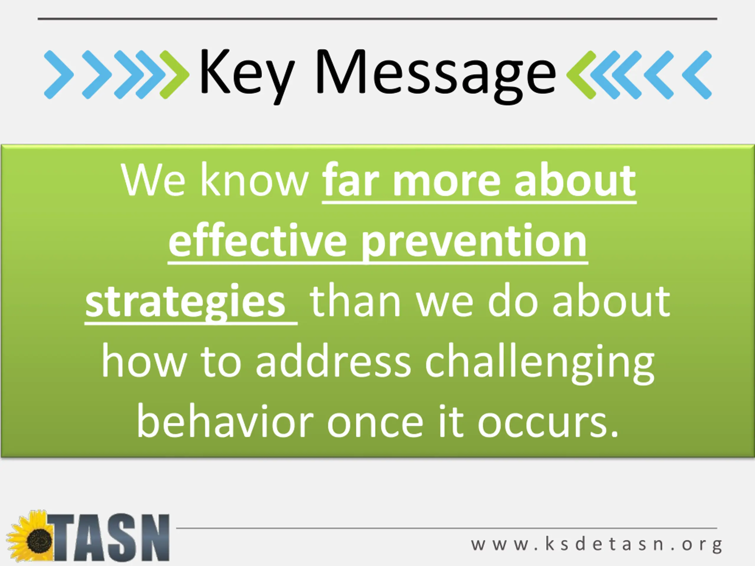 Key Message We know far more about effective prevention strategies than we do about how to address challenging behavior once it occurs. w w w . k s d e t a s n . o r g