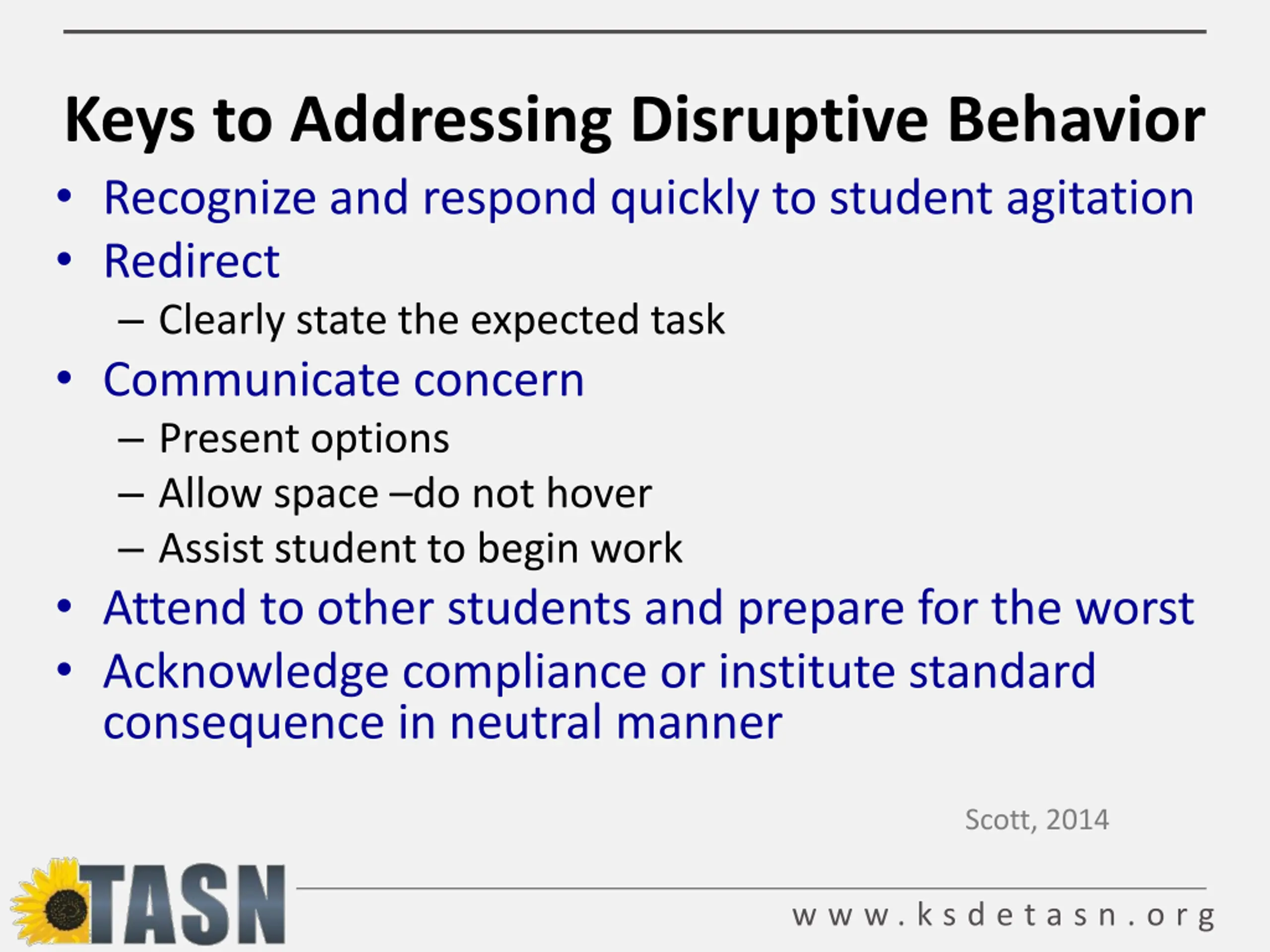 Keys to Addressing Disruptive Behavior Recognize and respond quickly to student agitation Redirect Clearly state the expected task Communicate concern Present options Allow space do not hover Assist student to begin work Attend to other students and prepare for the worst Acknowledge compliance or institute standard consequence in neutral manner Scott, 2014 w w w . k s d e t a s n . o r g