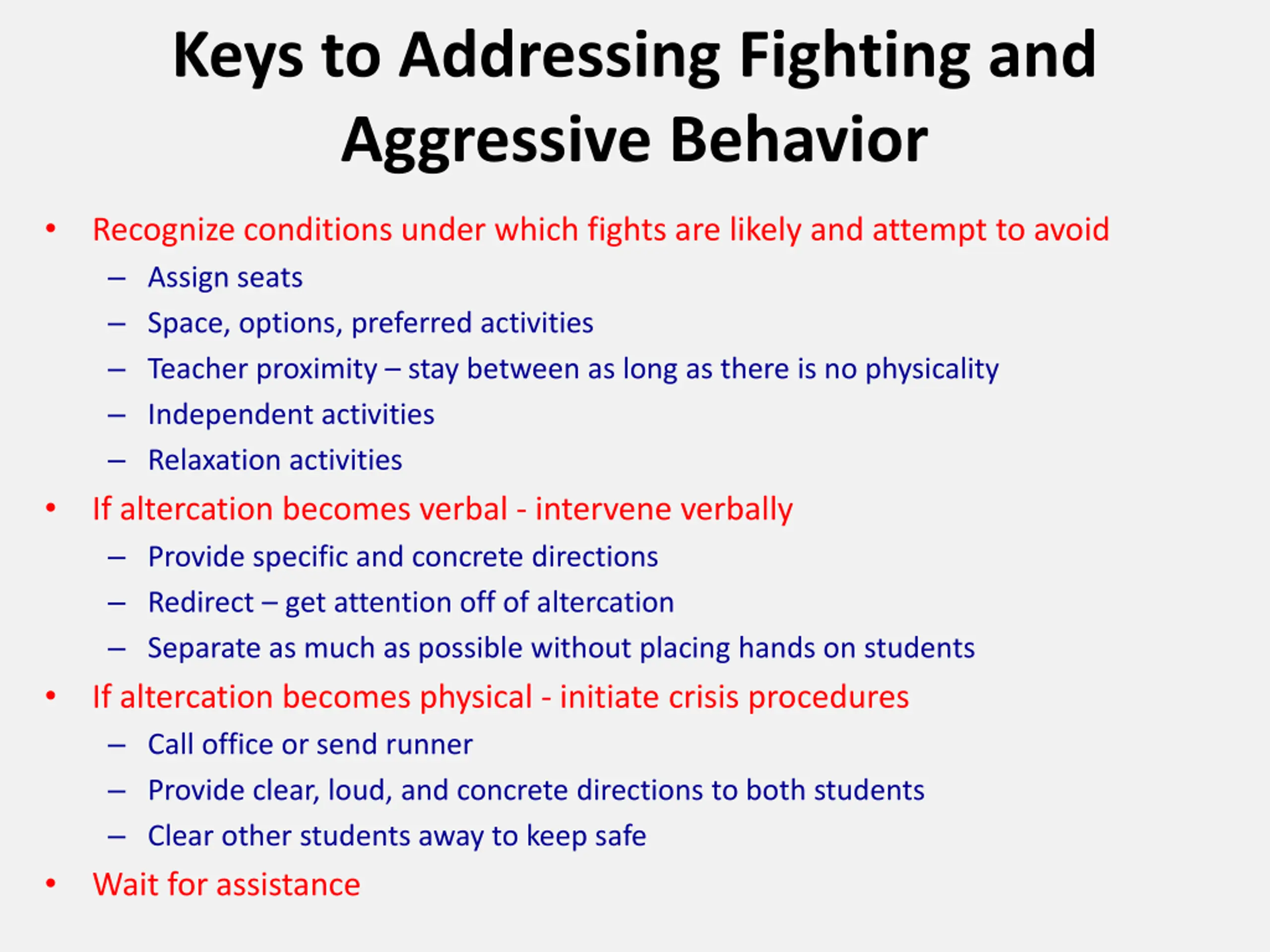 Keys to Addressing Fighting and Aggressive Behavior Recognize conditions under which fights are likely and attempt to avoid Assign seats Space, options, preferred activities Teacher proximity stay between as long as there is no physicality Independent activities Relaxation activities If altercation becomes verbal - intervene verbally Provide specific and concrete directions Redirect get attention off of altercation Separate as much as possible without placing hands on students If altercation becomes physical - initiate crisis procedures Call office or send runner Provide clear, loud, and concrete directions to both students Clear other students away to keep safe Wait for assistance