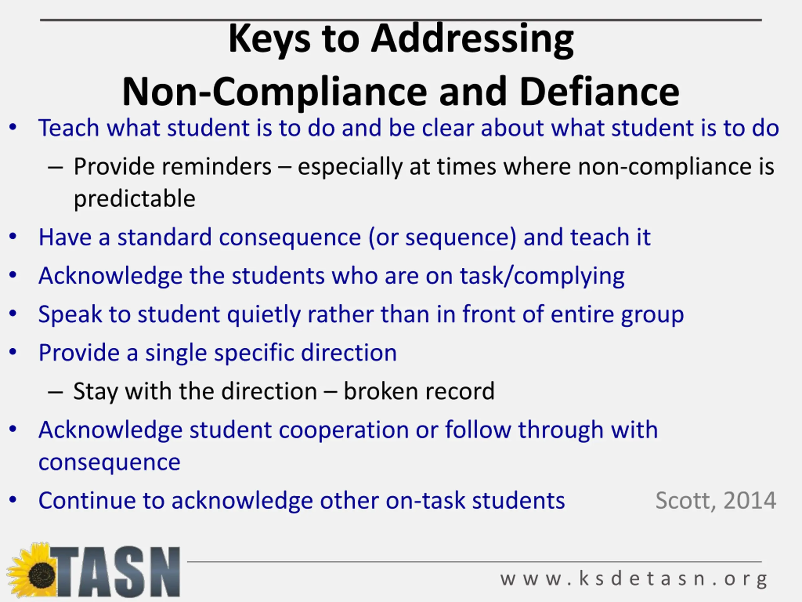 Keys to Addressing Non-Compliance and Defiance Teach what student is to do and be clear about what student is to do Provide reminders especially at times where non-compliance is predictable Have a standard consequence (or sequence) and teach it Acknowledge the students who are on task/complying Speak to student quietly rather than in front of entire group Provide a single specific direction Stay with the direction broken record Acknowledge student cooperation or follow through with consequence Continue to acknowledge other on-task students Scott, 2014 w w w . k s d e t a s n . o r g