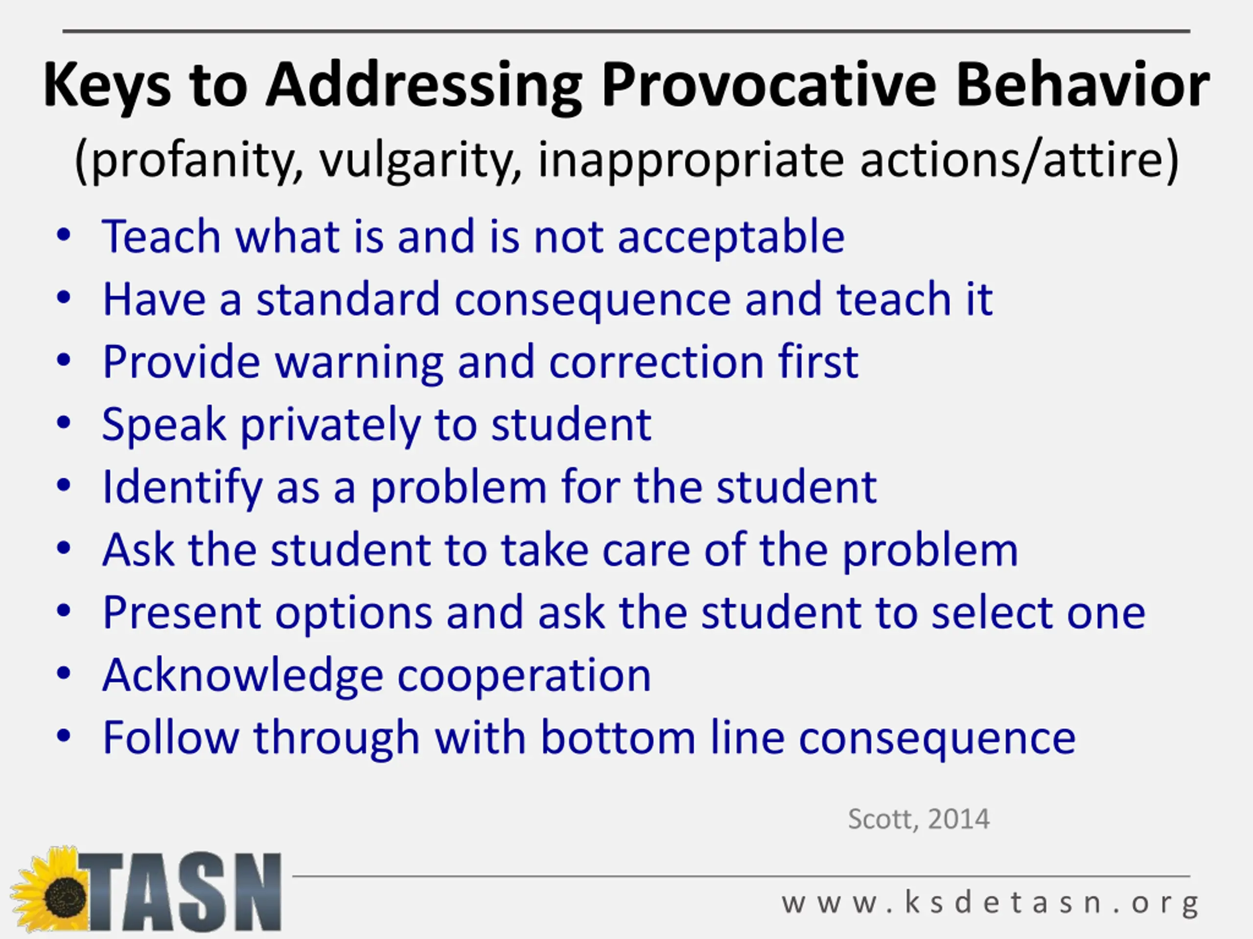 Keys to Addressing Provocative Behavior (profanity, vulgarity, inappropriate actions/attire) Teach what is and is not acceptable Have a standard consequence and teach it Provide warning and correction first Speak privately to student Identify as a problem for the student Ask the student to take care of the problem Present options and ask the student to select one Acknowledge cooperation Follow through with bottom line consequence Scott, 2014 w w w . k s d e t a s n . o r g