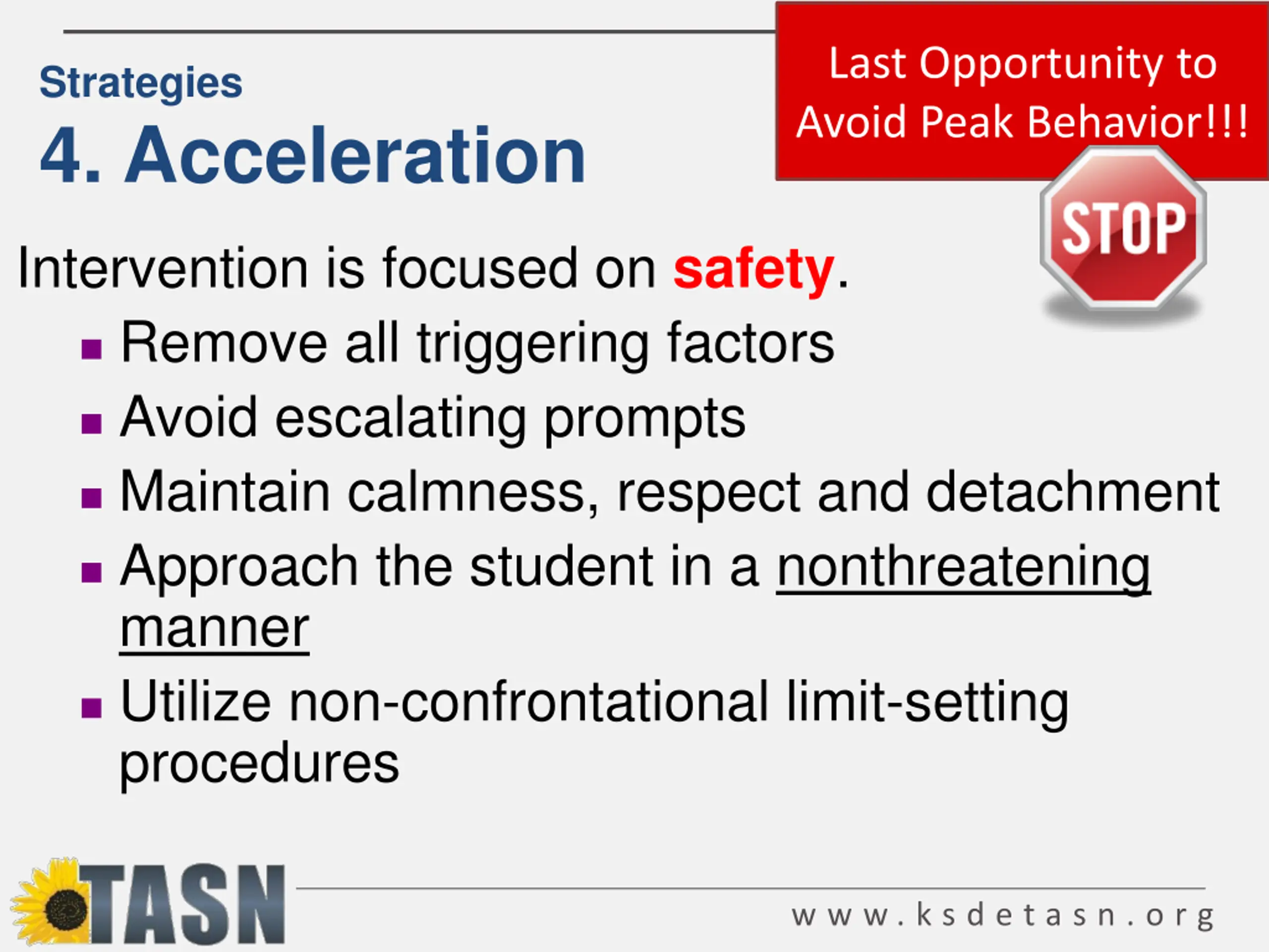 Last Opportunity to Avoid Peak Behavior!!! Strategies 4. Acceleration Intervention is focused on safety. Remove all triggering factors Avoid escalating prompts Maintain calmness, respect and detachment Approach the student in a nonthreatening manner Utilize non-confrontational limit-setting procedures w w w . k s d e t a s n . o r g