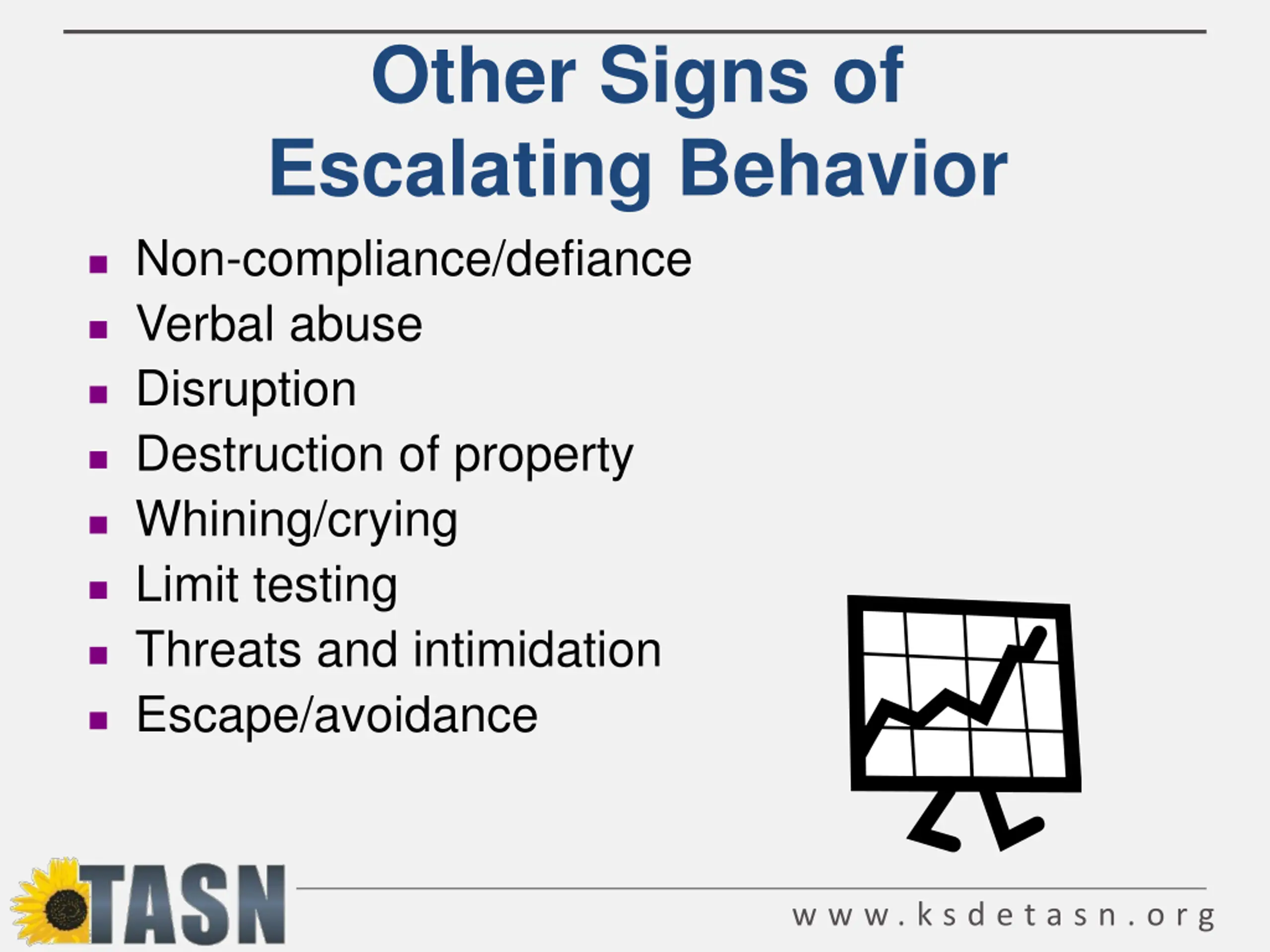 Other Signs of Escalating Behavior Non-compliance/defiance Verbal abuse Disruption Destruction of property Whining/crying Limit testing Threats and intimidation Escape/avoidance w w w . k s d e t a s n . o r g