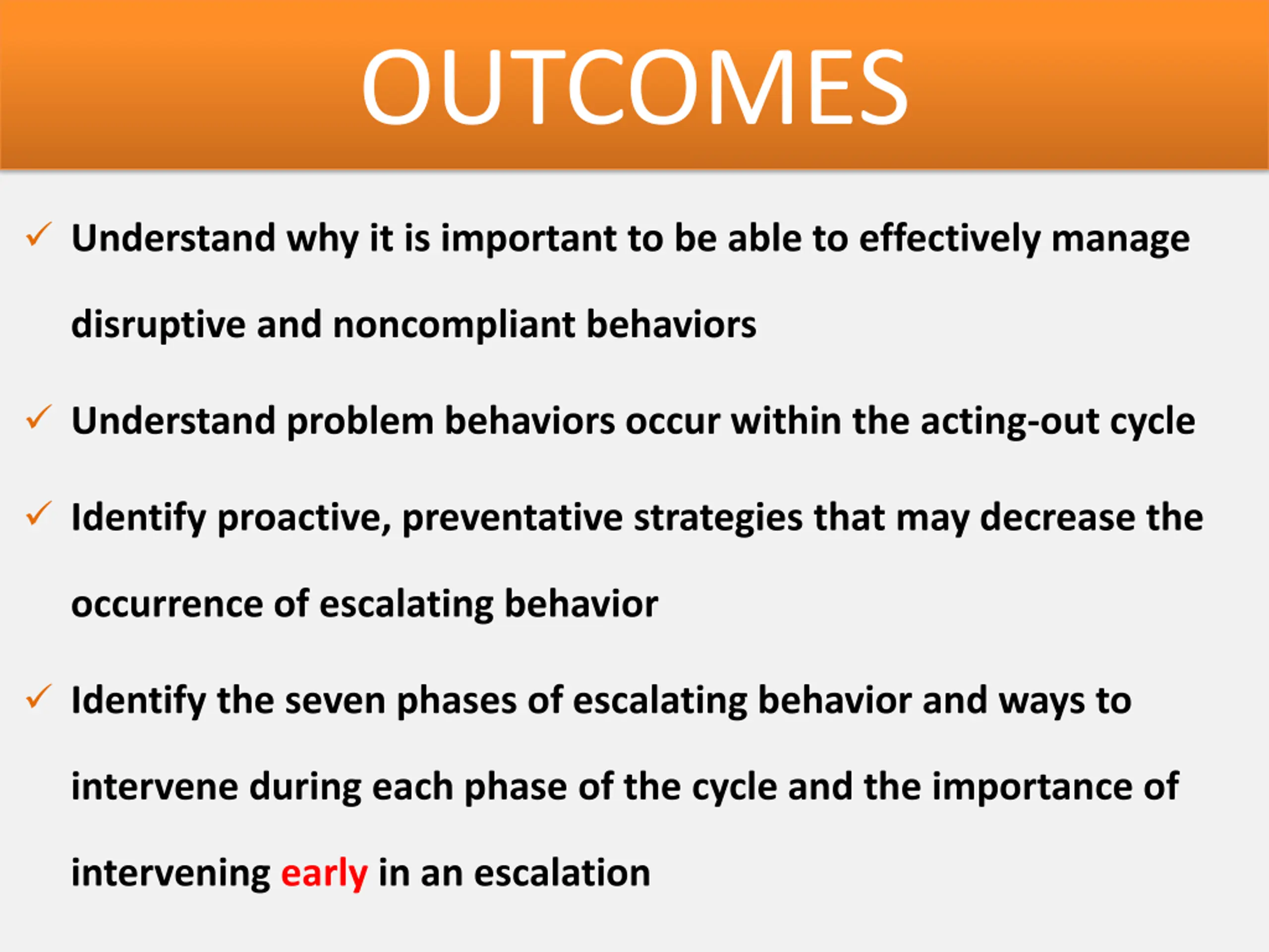 OUTCOMES Understand why it is important to be able to effectively manage disruptive and noncompliant behaviors Understand problem behaviors occur within the acting-out cycle Identify proactive, preventative strategies that may decrease the occurrence of escalating behavior Identify the seven phases of escalating behavior and ways to intervene during each phase of the cycle and the importance of intervening early in an escalation