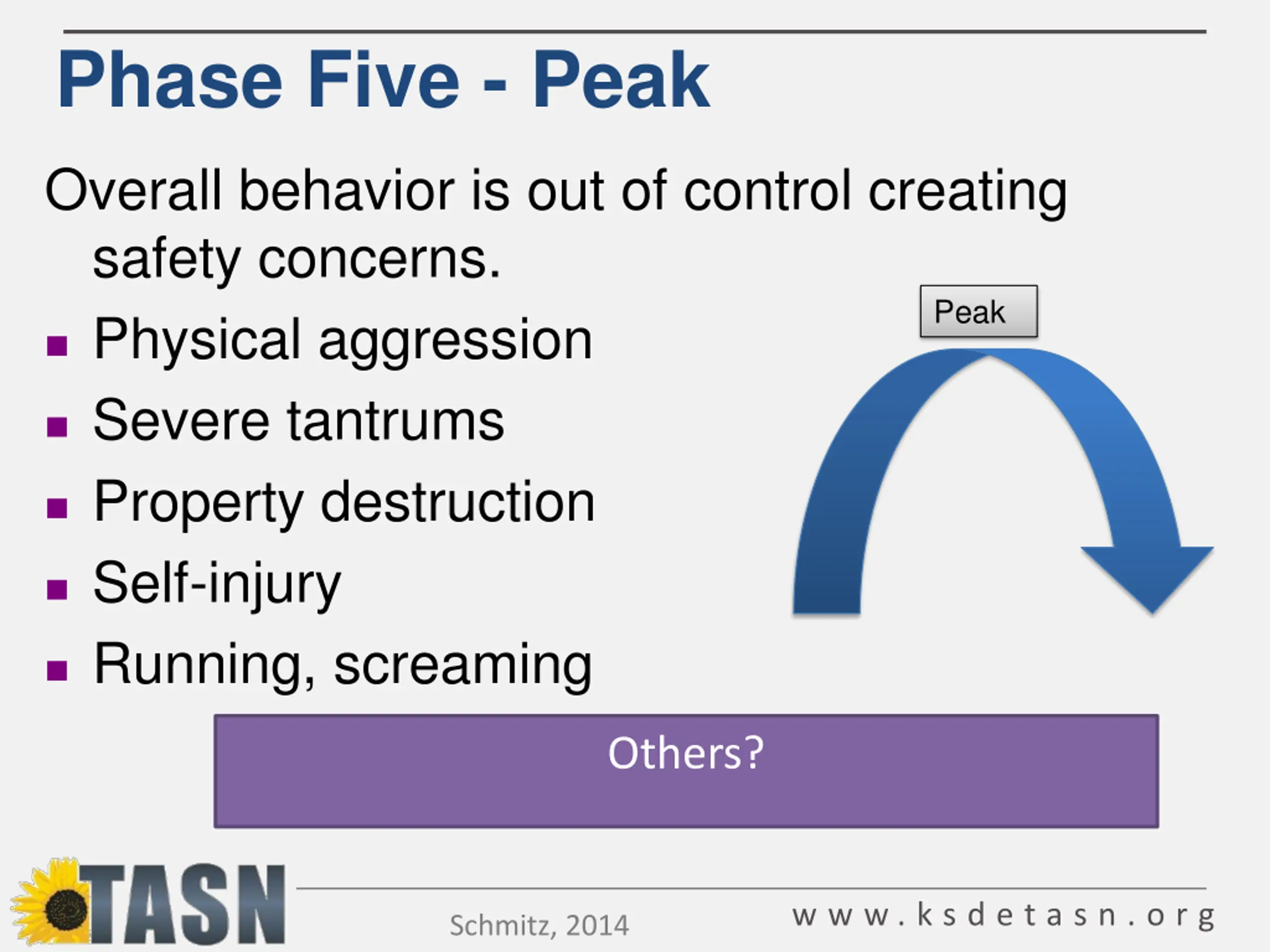 Phase Five - Peak Overall behavior is out of control creating safety concerns. Physical aggression Severe tantrums Property destruction Self-injury Running, screaming Peak Others? w w w . k s d e t a s n . o r g Schmitz, 2014