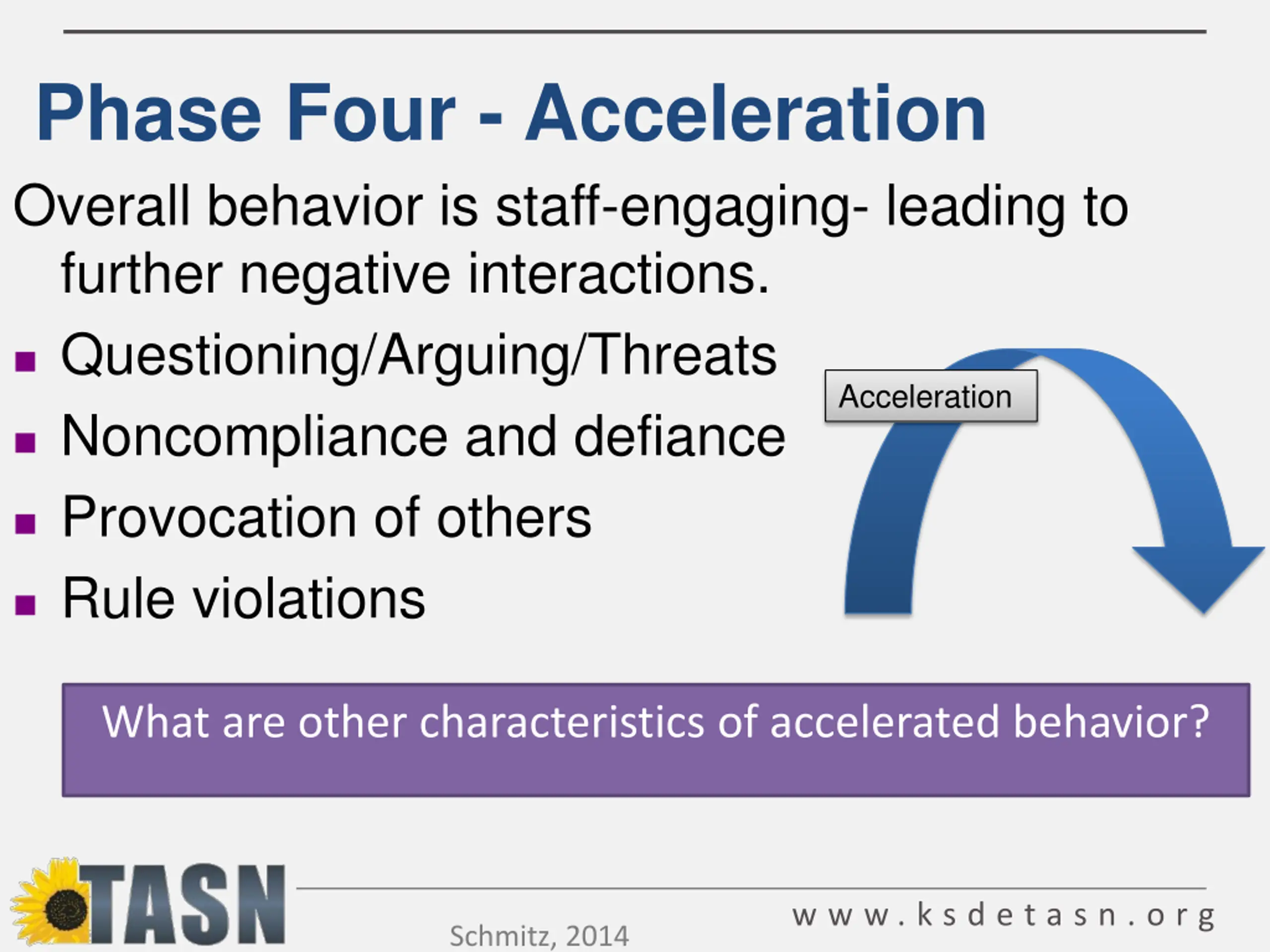 Phase Four - Acceleration Overall behavior is staff-engaging- leading to further negative interactions. Questioning/Arguing/Threats Noncompliance and defiance Provocation of others Rule violations Acceleration What are other characteristics of accelerated behavior? w w w . k s d e t a s n . o r g Schmitz, 2014
