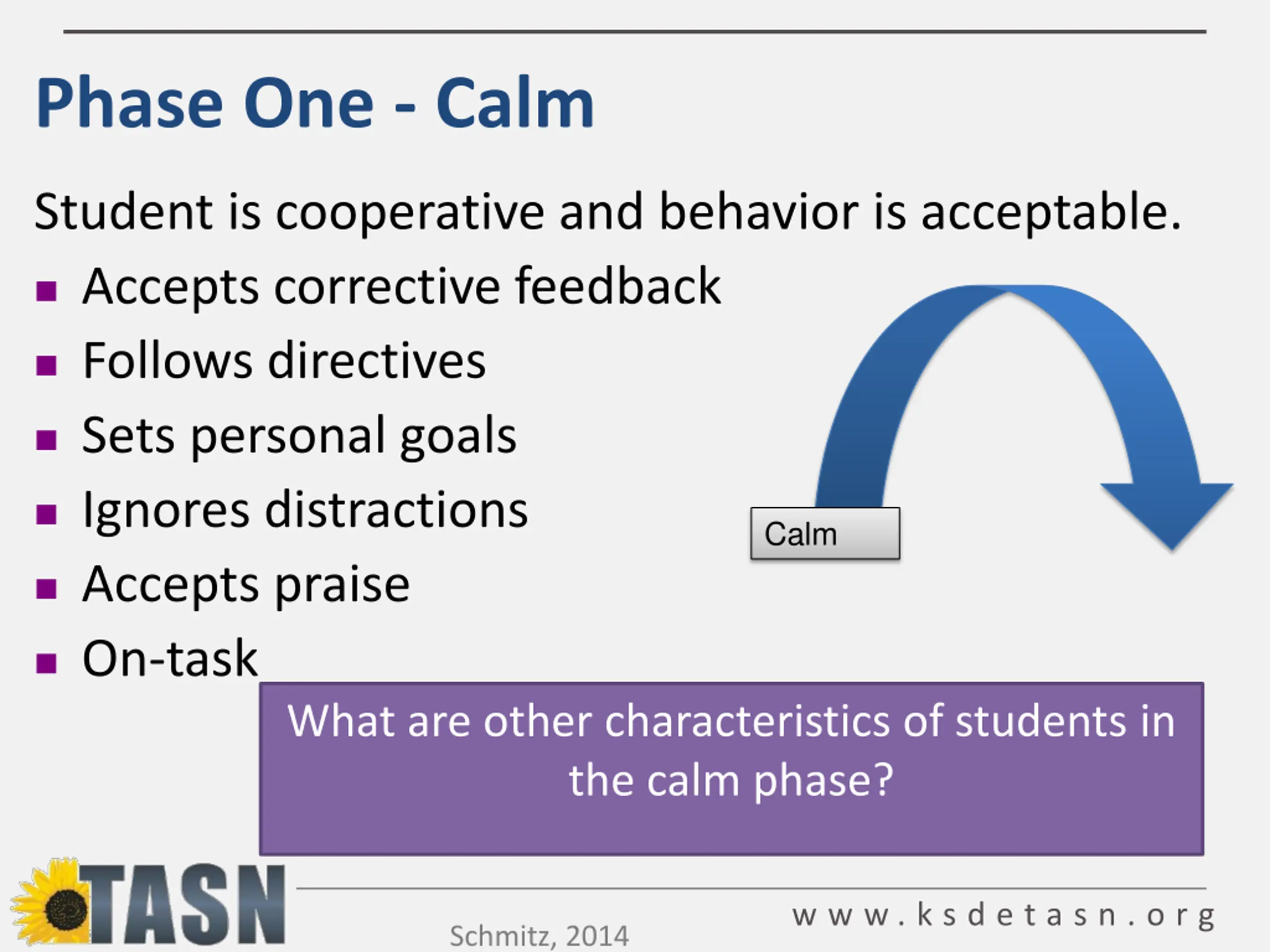 Phase One - Calm Student is cooperative and behavior is acceptable. Accepts corrective feedback Follows directives Sets personal goals Ignores distractions Calm Accepts praise On-task What are other characteristics of students in the calm phase? w w w . k s d e t a s n . o r g Schmitz, 2014