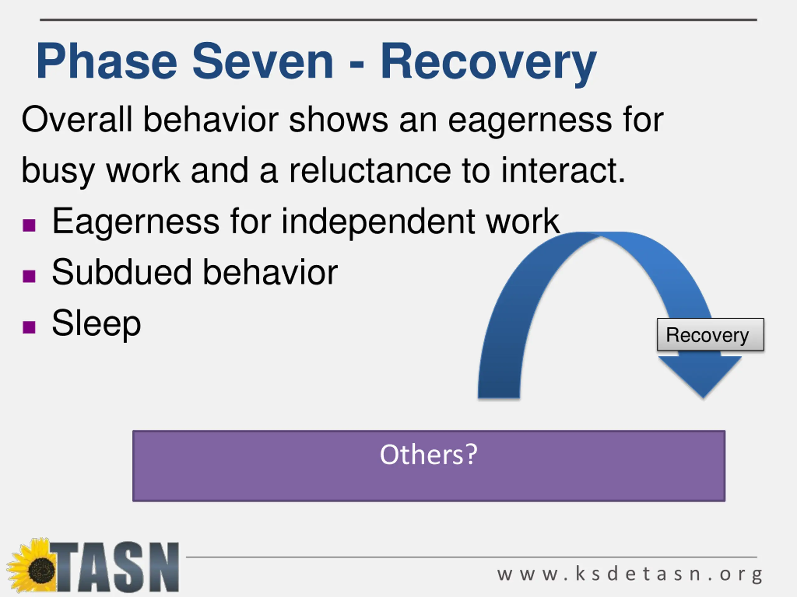 Phase Seven - Recovery Overall behavior shows an eagerness for busy work and a reluctance to interact. Eagerness for independent work Subdued behavior Sleep Recovery Others? w w w . k s d e t a s n . o r g