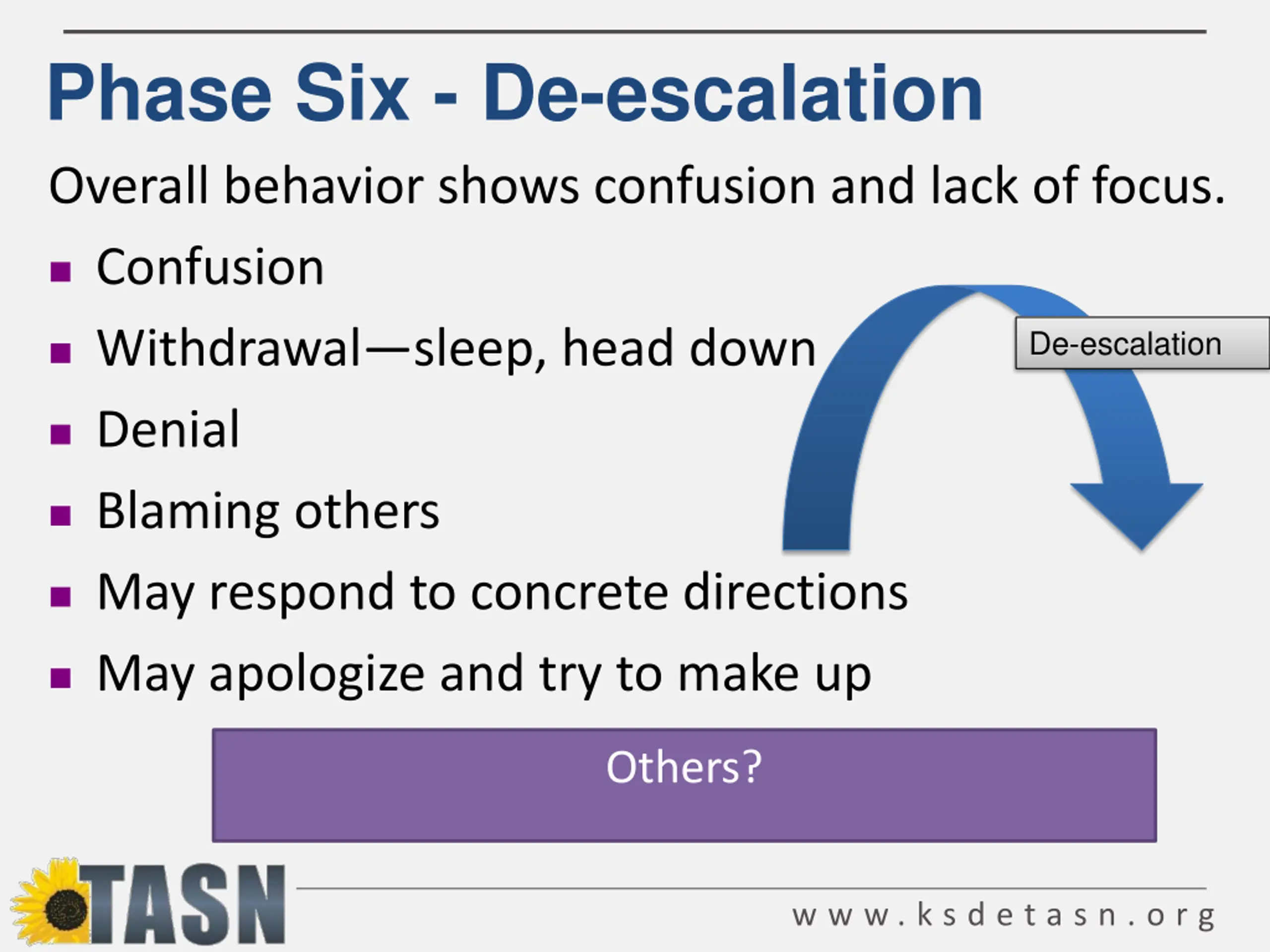 Phase Six - De-escalation Overall behavior shows confusion and lack of focus. Confusion Withdrawal sleep, head down De-escalation Denial Blaming others May respond to concrete directions May apologize and try to make up Others? w w w . k s d e t a s n . o r g