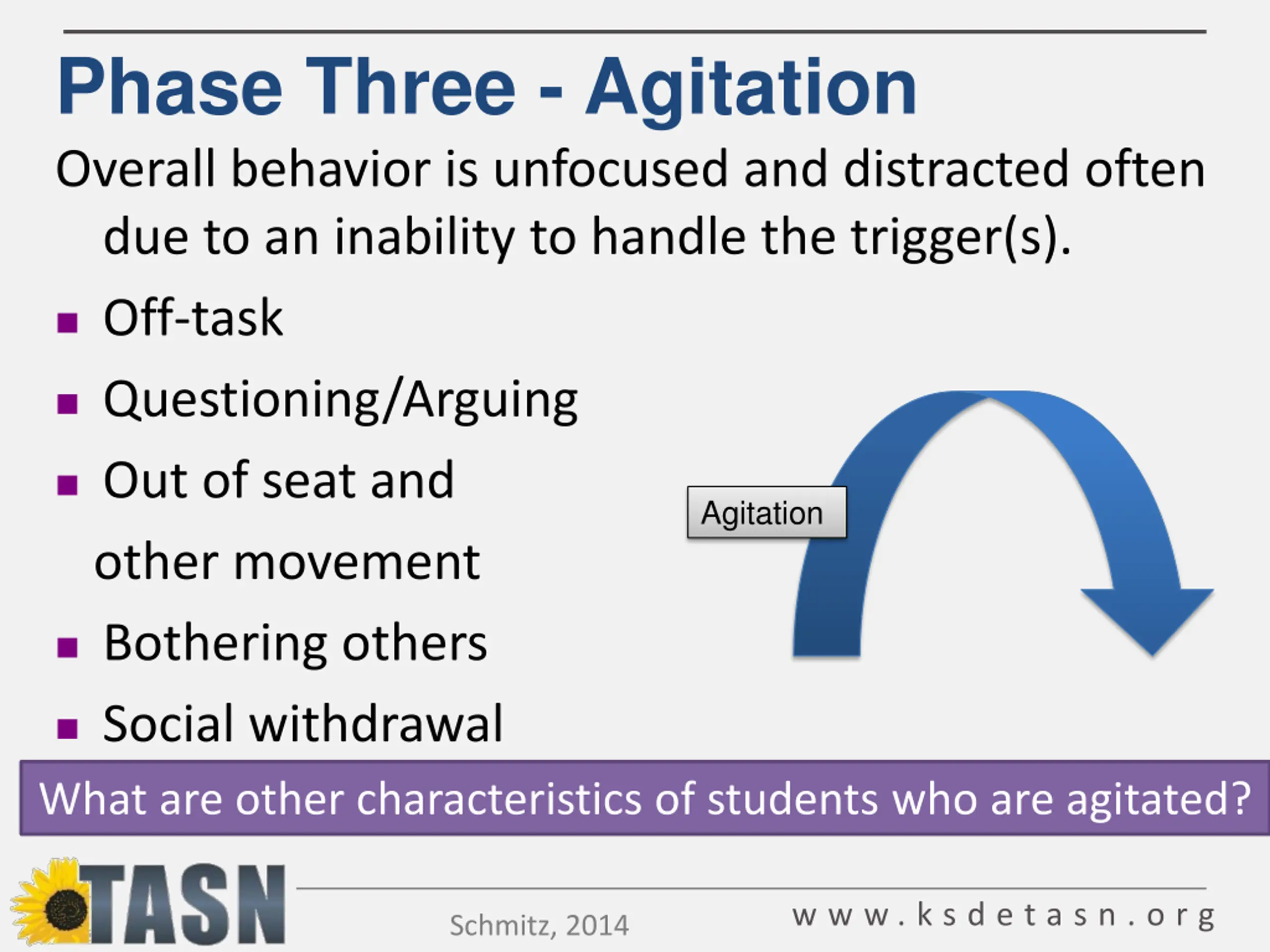 Phase Three - Agitation Overall behavior is unfocused and distracted often due to an inability to handle the trigger(s). Off-task Questioning/Arguing Out of seat and other movement Agitation Bothering others Social withdrawal What are other characteristics of students who are agitated? w w w . k s d e t a s n . o r g Schmitz, 2014